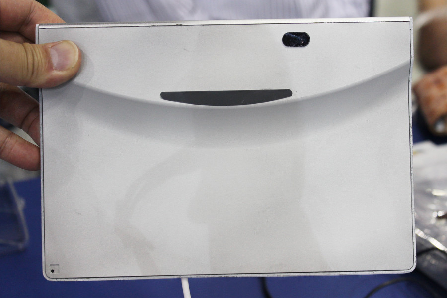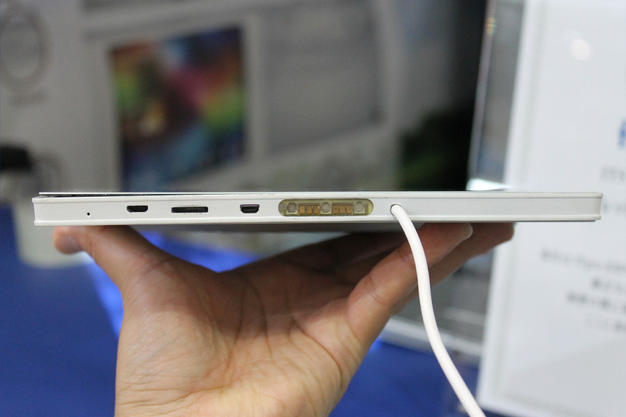 天面には、プロジェクターの出力用レンズおよびプロジェクター用ピント調整用スイッチ、2W+2Wのステレオスピーカーが配置されています。底面には、左からマイクおよびmicroUSB端子、microSDスロット、microHDMI入力端子、クレイドル接続時の充電用接点があります。底面から伸びているケーブルは、試作品用の電源供給ケーブルで実際の製品ではなくなっているそうです。