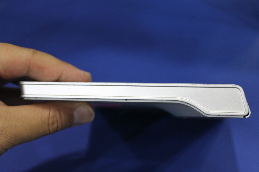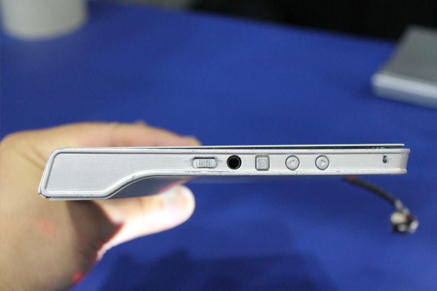 右側面にボタン類はありません。左側面側には、左からスライド式プロジェクタースイッチおよび3.5mmイヤフォンジャック、電源ボタン、音量ボタンとなっています。側面からの図を見てわかる通り、プロジェクターと大出力スピーカーを搭載している関係上天面側の厚みが大きく増しています。