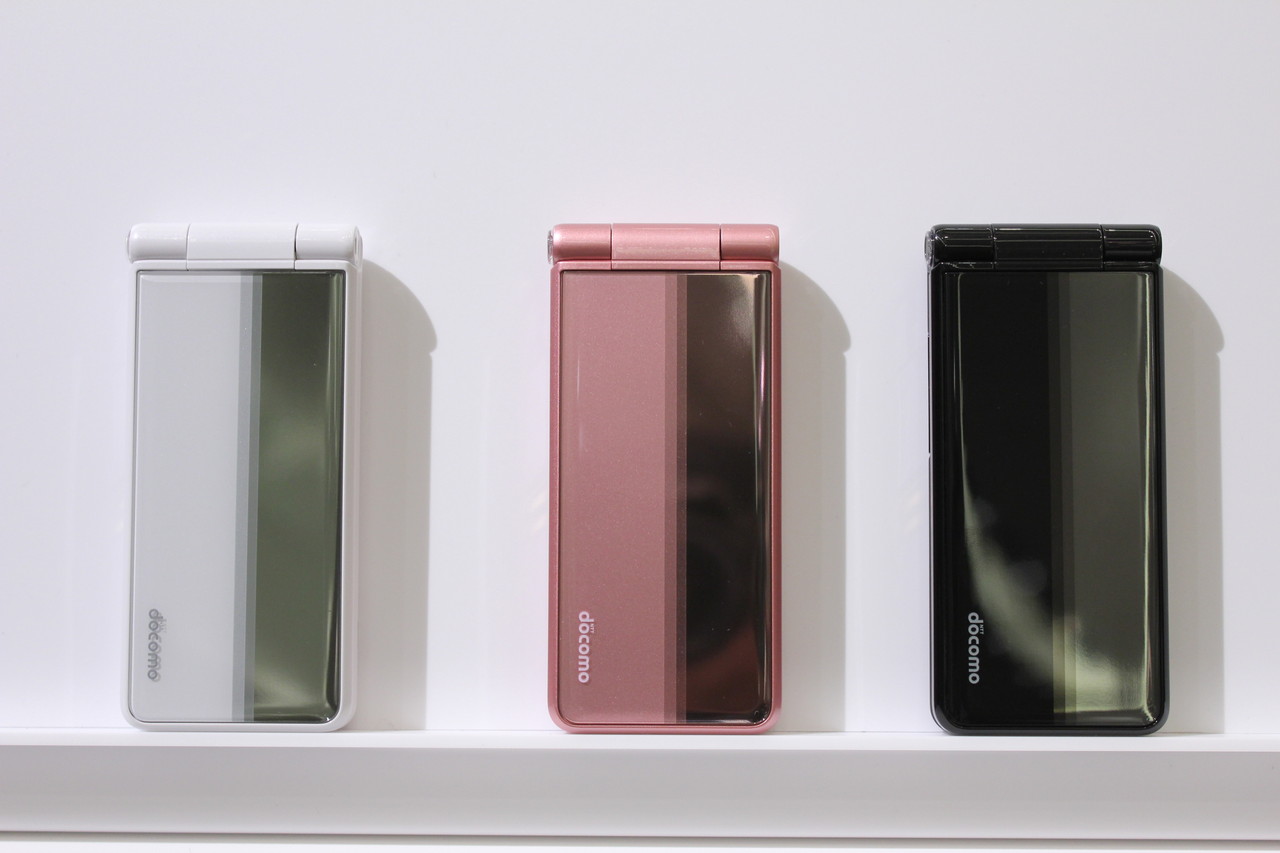 P-01Fの開いたところ。左からホワイト、ピンク、ブラック。