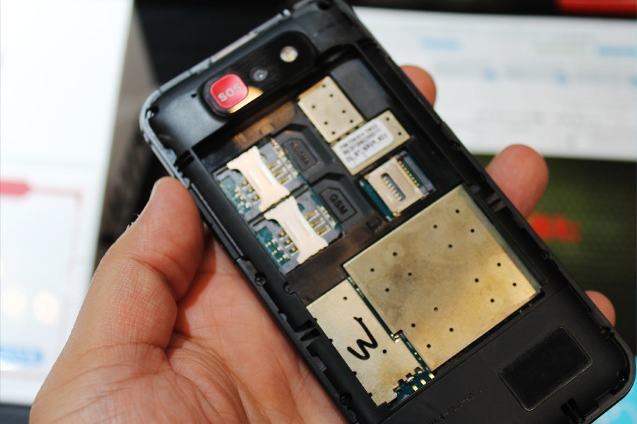 背面には、フラッシュライト付約500万画素のアウトカメラと外部スピーカー、緊急発信用のSOSボタン、動画撮影用マイクがあります。なお、背面カバーは外すことが可能でバッテリーやSIMカード・メモリーカードスロットが確認できます。