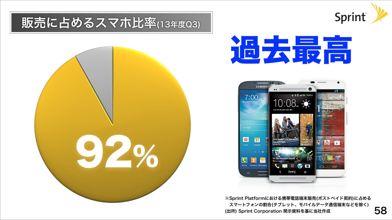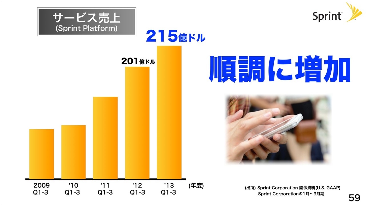 Sprintの販売に占めるスマホ比率は過去最高になっており、2013年度Q1~3ではサービス売上は215億ドルと順調に増加し、営業利益(償却前)は43億ドルと反転へ向かっているとのこと。