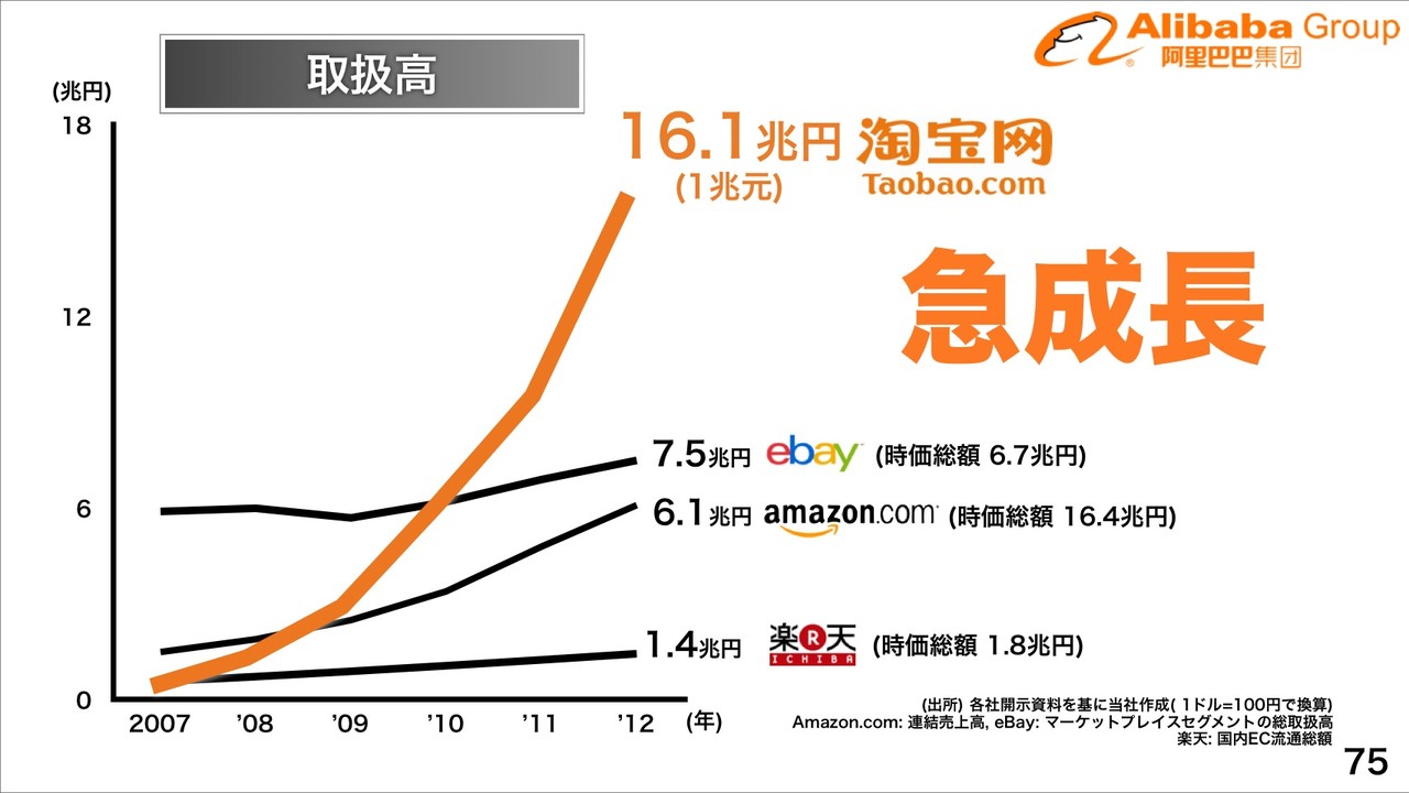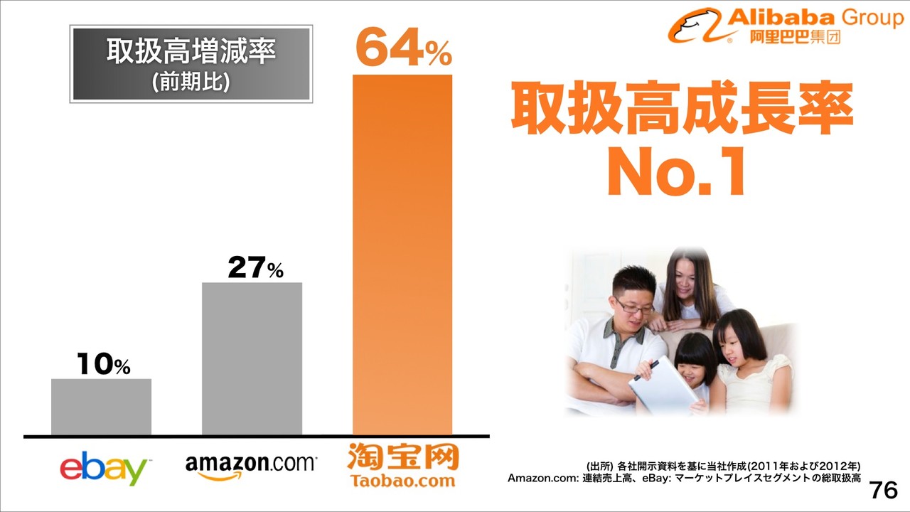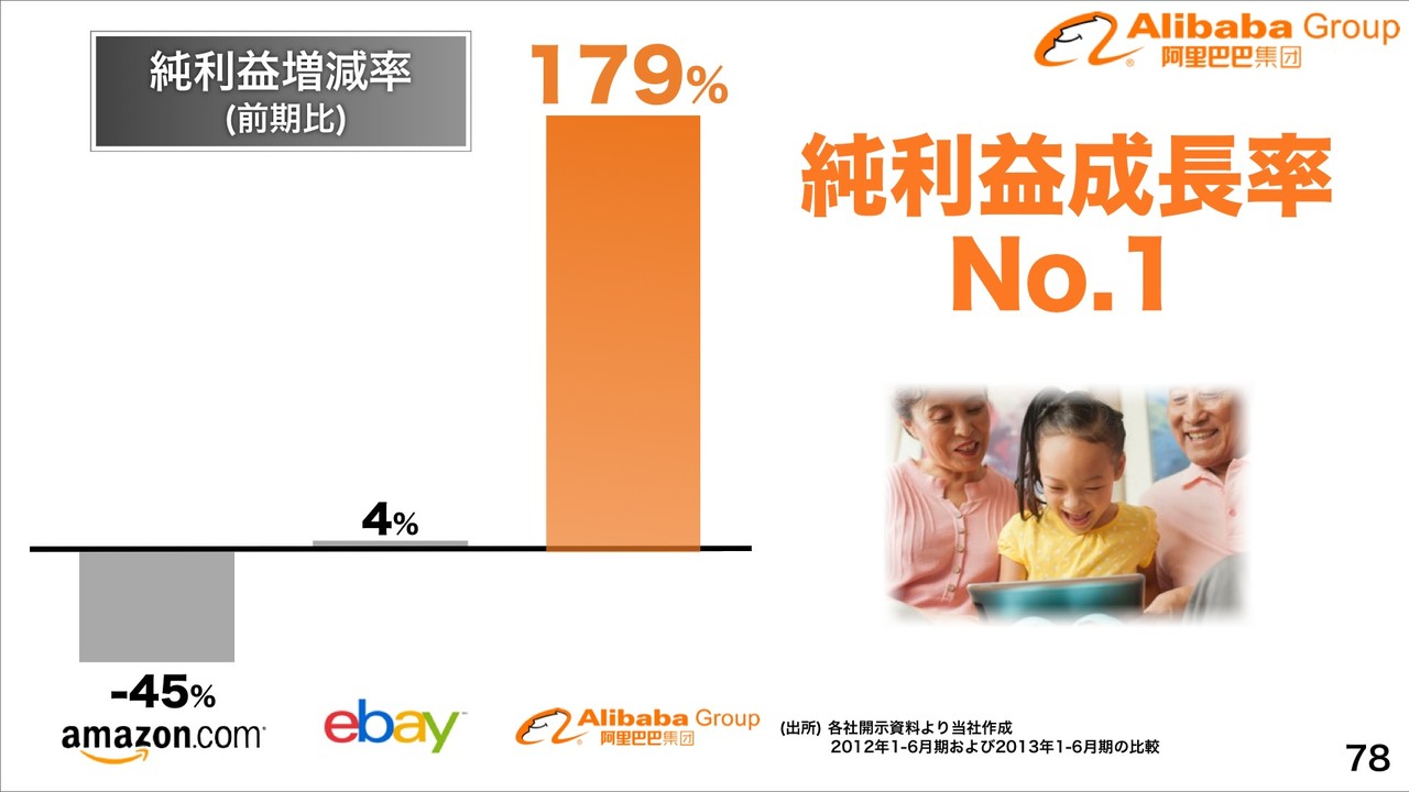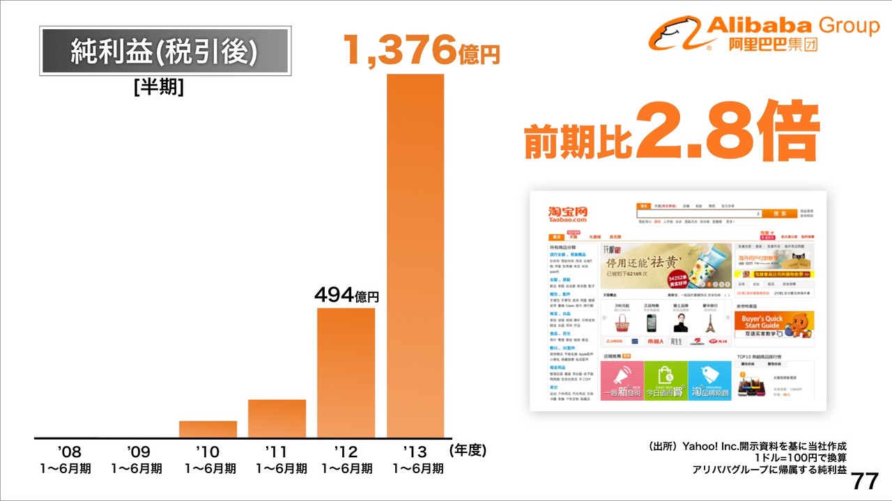 海外でも2013年現在、商品数No.1、EC流通総額No.1なのがソフトバンクグループのAlibaba傘下「Taobao」で、Taobaoの2012年度取扱高が16.1兆円までまだ急成長中で、取扱高成長率もNo.1になっており、純利益(税引後)が前期比2.8倍、Alibabaグループの純利益成長率もNo.1になっているとしています。