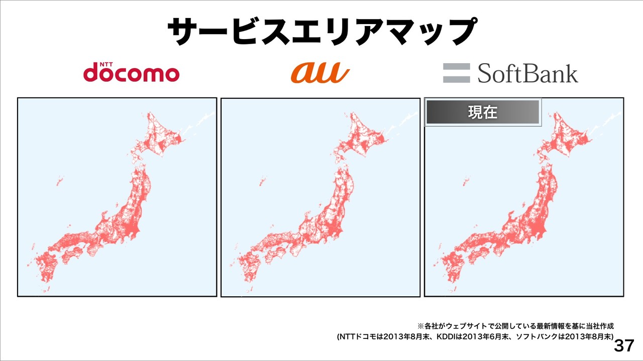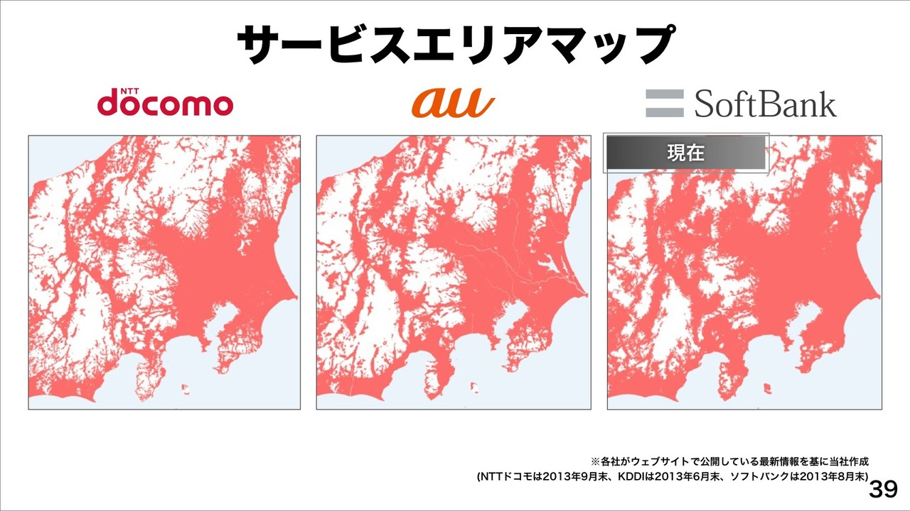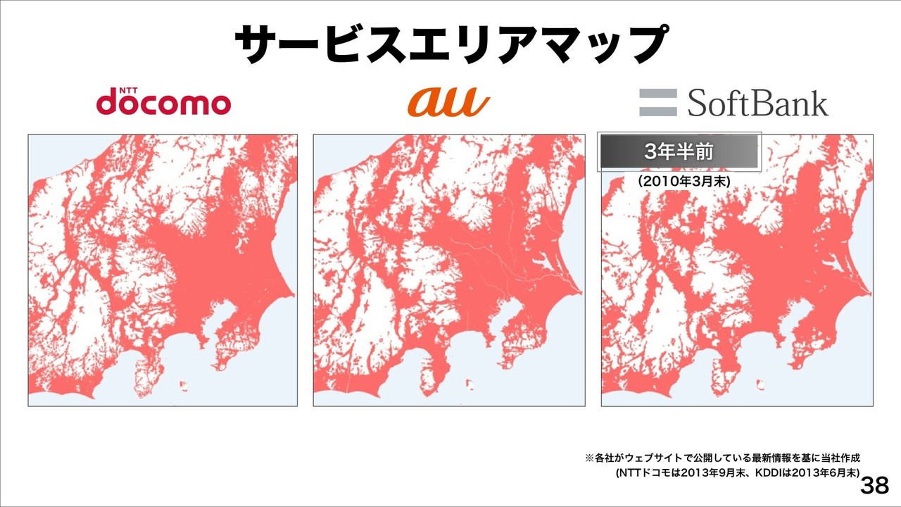 続けて、プラチナバンドによって3年半前と比べ、現在は、サービスエリアが大幅に改善したことをエリアマップで紹介。