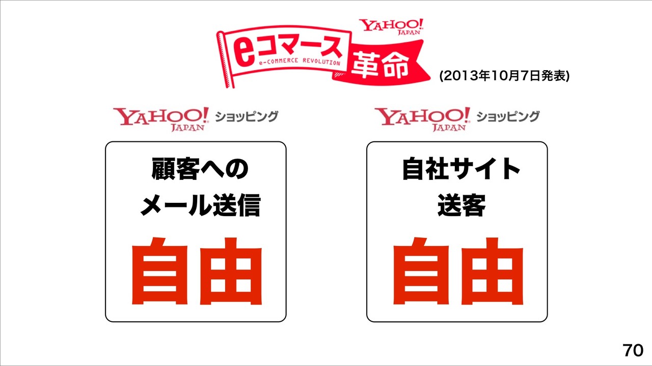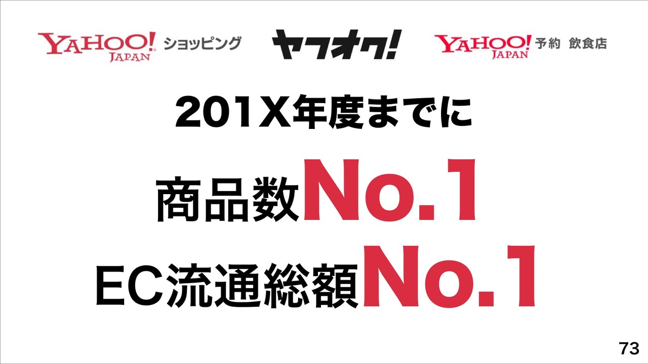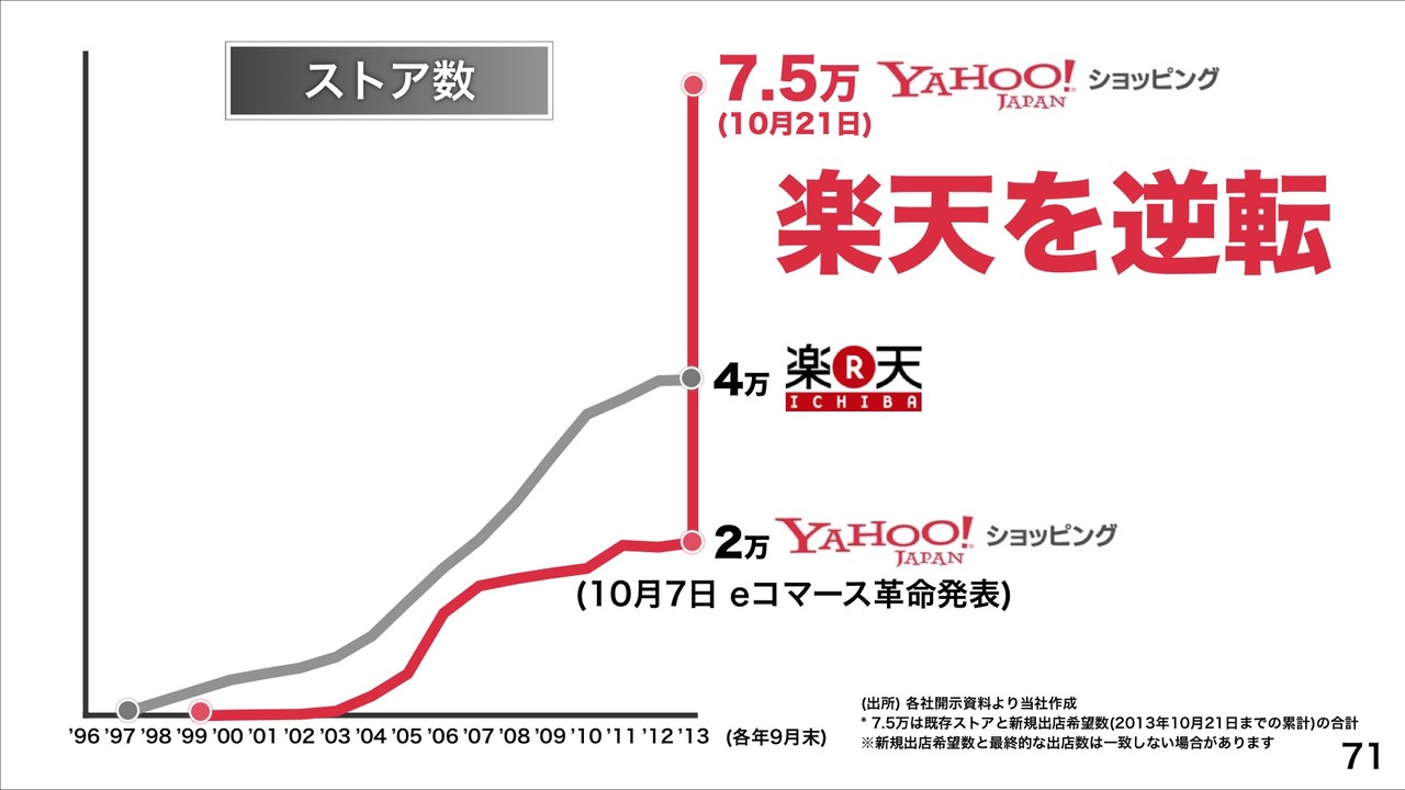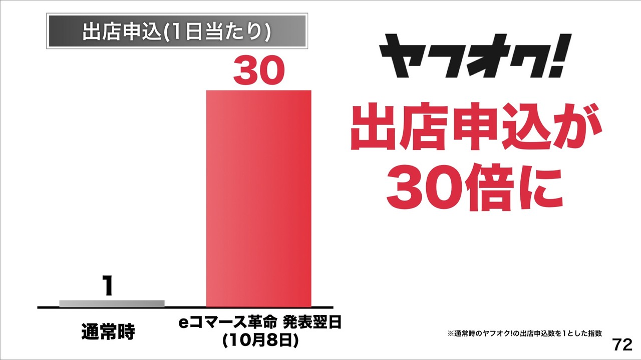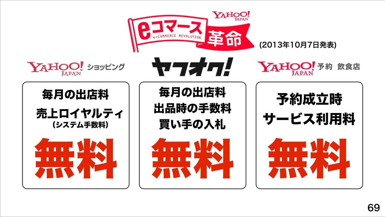 先日10月7日に発表された「ヤフーショッピング」や「ヤフオク!」、「ヤフー予約 飲食店」の各種手数料などを無料化で「eコマース革命」を起こしていくとのこと。これにより、すでにヤフーショッピングの既存ストアおよび新規出店希望数がeコマース革命発表後、2週間で計7.5万件になり、楽天市場を超える予定だとしています。また、ヤフオク!の1日当たり出店申込は発表翌日30倍になっているということで、ヤフーショッピングやヤフオク!、ヤフー予約 飲食店が201X年度までに商品数No.1、EC流通総額No.1をめざすとしています。