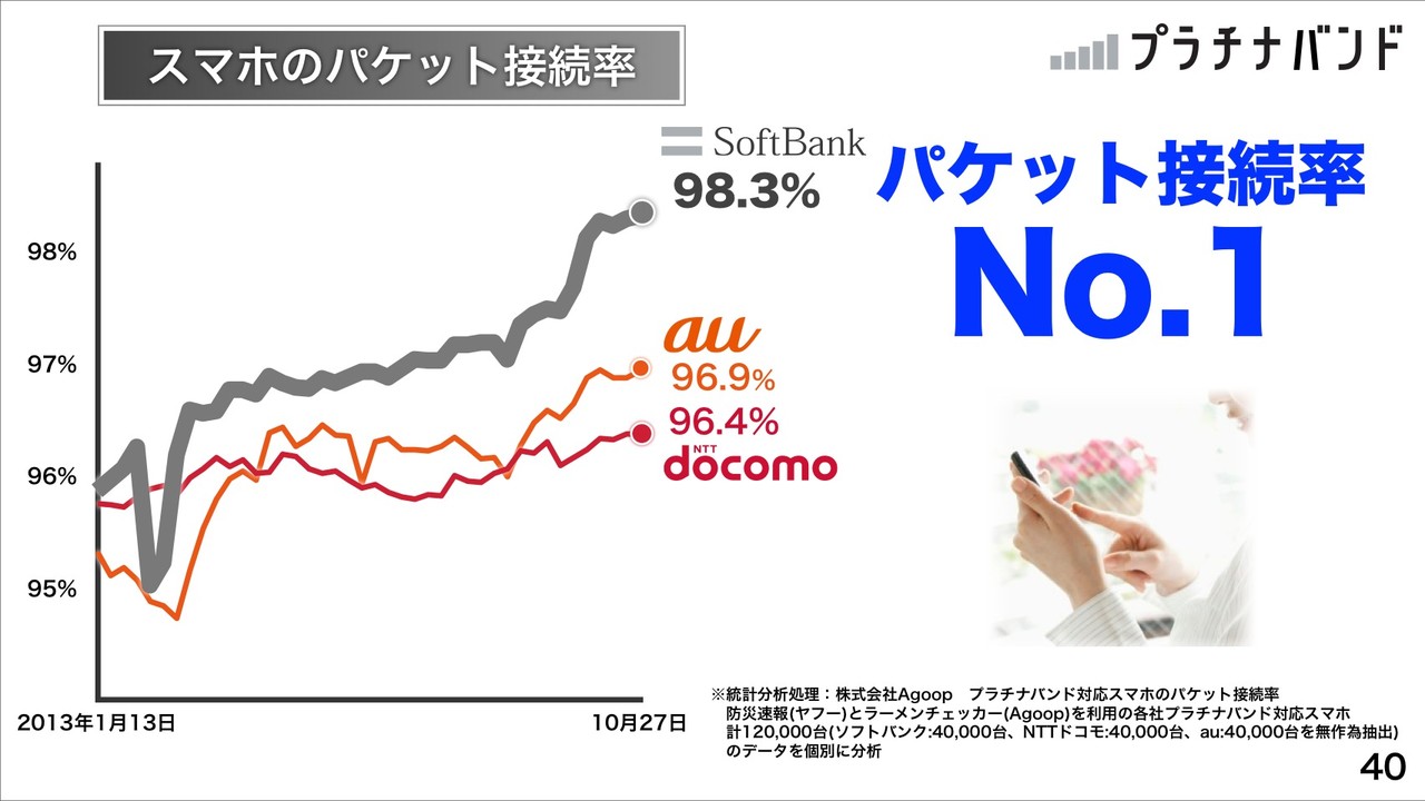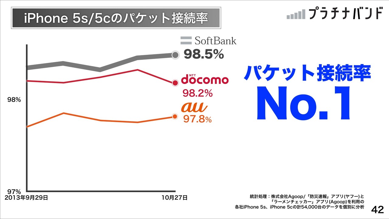 さらに、スマホのパケット接続率No.1として、子会社のAgoopによる調査による10月27日調査時点でランドマーク別の調査でも他社に完勝していると説明。同じく10月27日調査時点でのiPhone 5sおよびiPhone 5cパケット接続率もNo.1となり、NTTドコモがiPhone取り扱いをはじめたことで、3社を同じ機種で平等に比較できるようになったと説明。