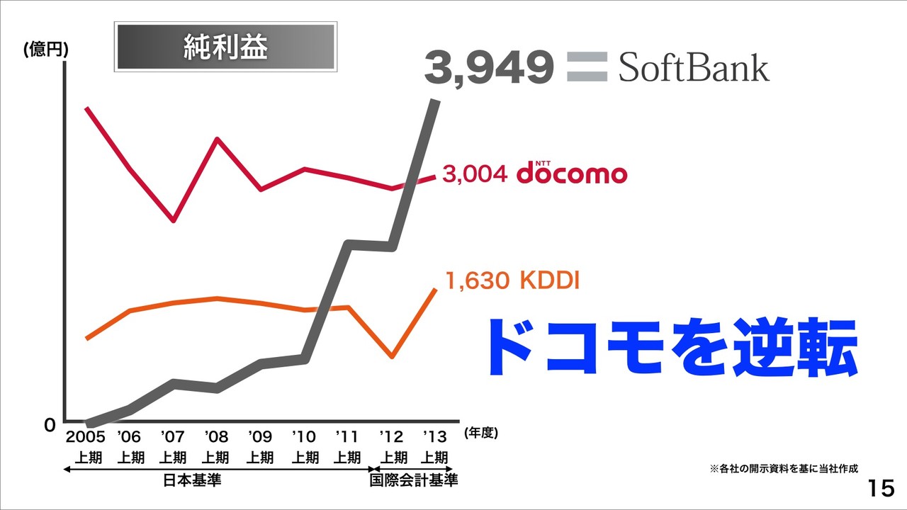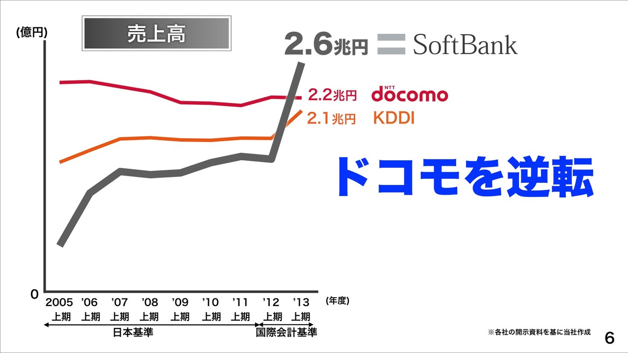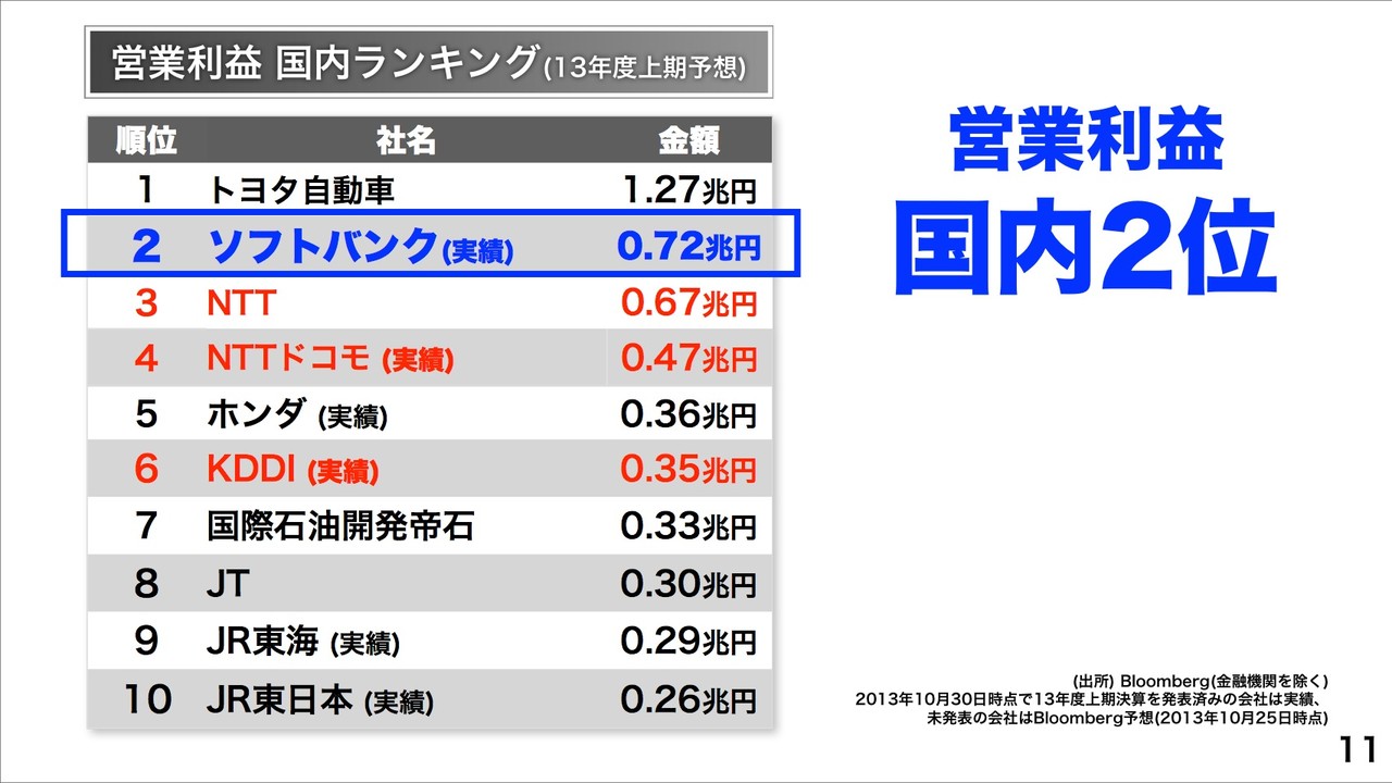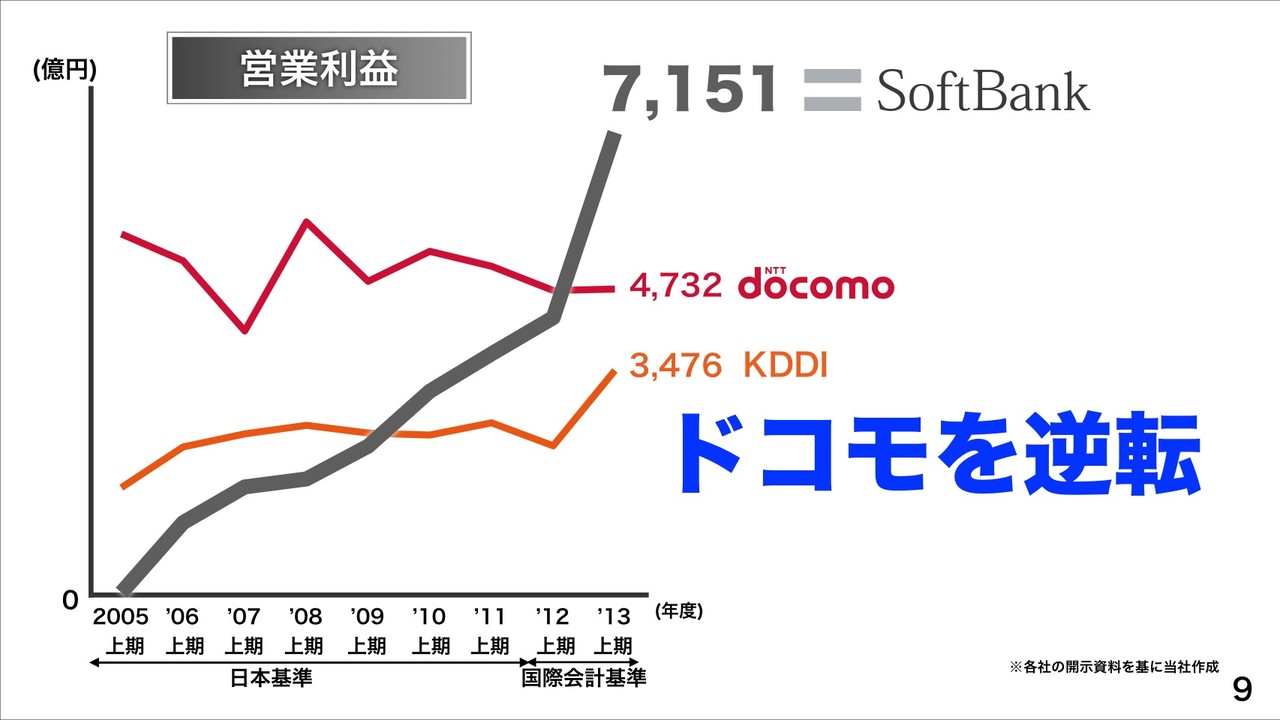 営業利益においてNTTドコモを逆転し、増減率(前期比)は+67%に大幅増益したということです。買収による増益に批判があることを察したのか、孫社長は「(買収による)飛び道具でも何でもいい。要は超えればいい。法をおかしたりといった悪いことをしなければ。背の低い人なら高い靴を履けばいい。」などと説明し、買収による増益であっても収益には違いないことを強調していました。