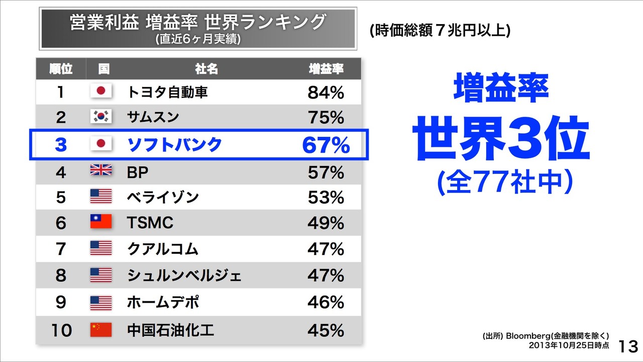 続いて、営業利益ランキングではトヨタ自動車に続き国内2位になり、世界でも24位の水準に達するとのこと。時価総額7兆円以上の企業の営業利益増減率ランキングでも世界3位に達するということです。