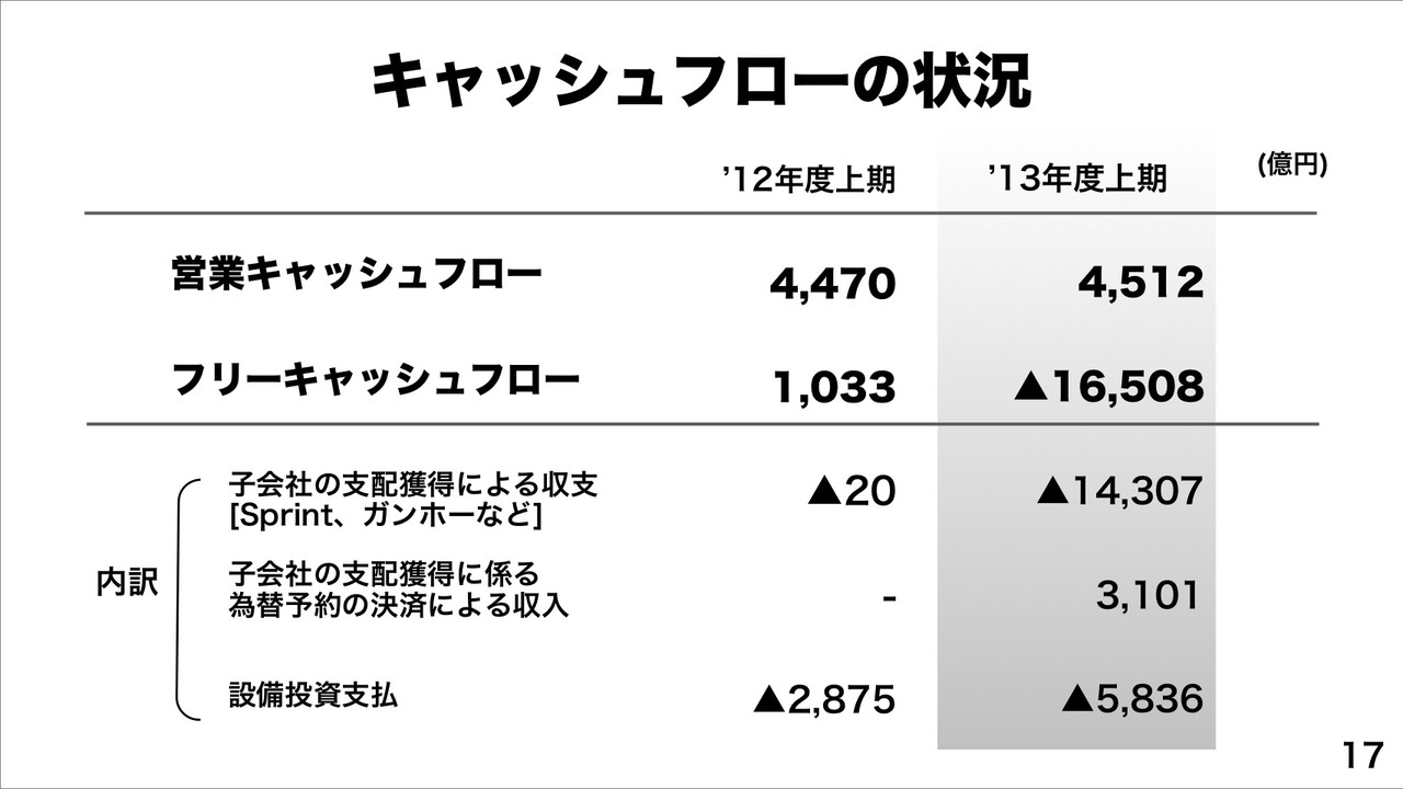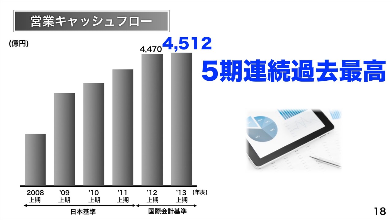 なお、キャッシュフローの状況としては、営業キャッシュフローが4,512億円で5期連続過去最高のほか、フリーキャッシュフローが-16,508億円で、主に子会社の支配獲得による収支が-14,307億円、設備投資支払が-5,836億円によるもの。