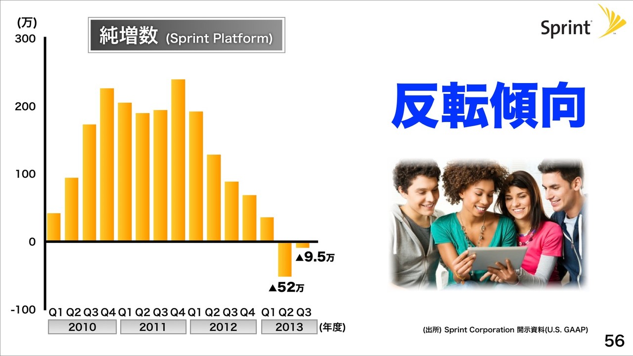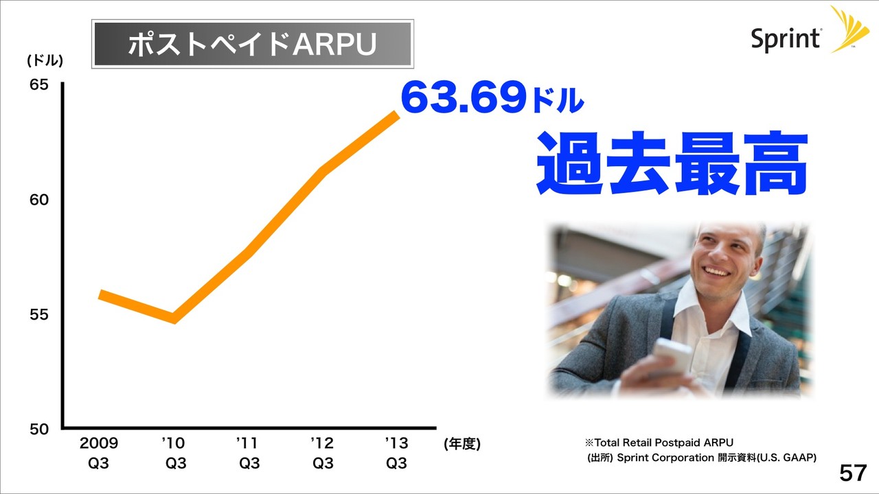 米国で買収したSprintについても買収後に反転へ向け純増数がプラスへ反転傾向、ポストペイドARPUが2013年度Q3に63.69ドルと過去最高になっていると紹介。