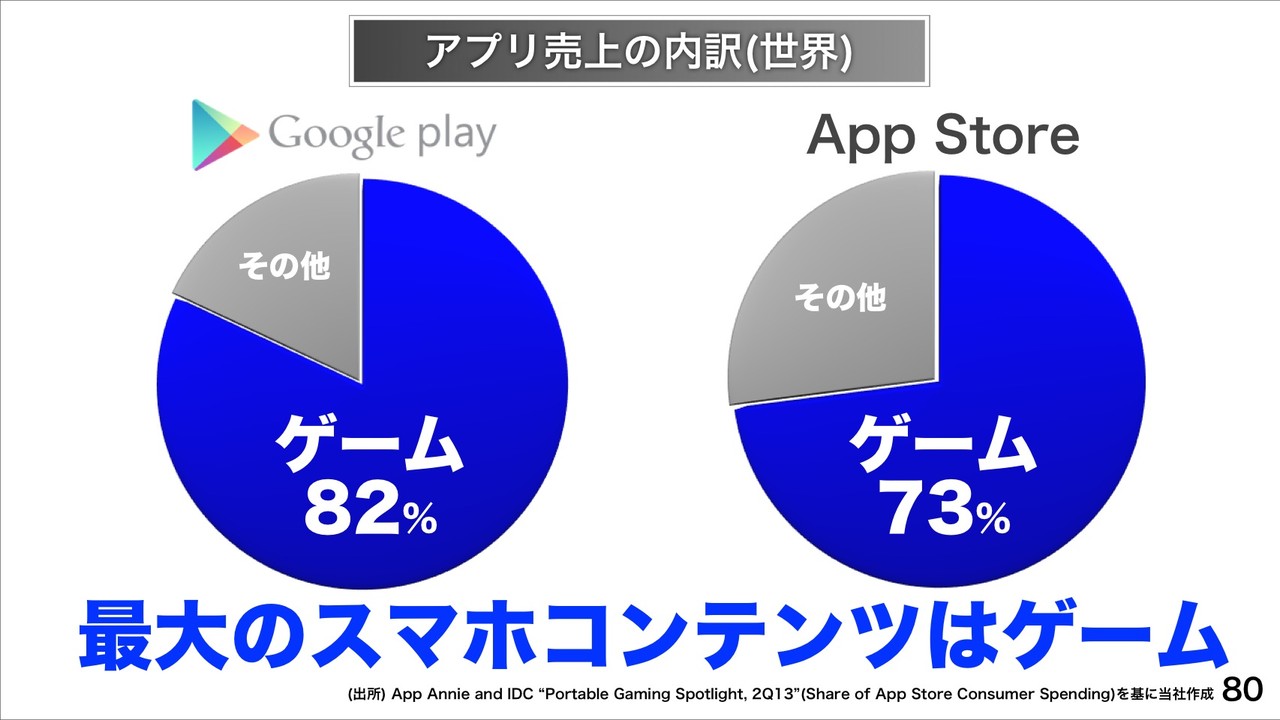 一方で、最近子会社化したガンホーや買収したSuperCellといったスマホゲーム会社についても重要だとし、「ゲームを制するものがスマホコンテンツを制する。」とのこと。現在、世界のアプリ売上の内訳では、Androidの「Google Play」、iOSの「App Store」ともに最大のスマホコンテンツは「ゲーム」であることを示し、モバイルゲーム市場は急成長していると紹介。