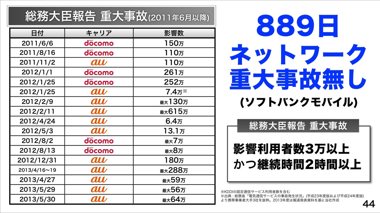 総務大臣報告の重大事故(影響利用者数3万以上、かつ継続時間2時間以上)も2011年6月以降、ソフトバンクモバイルは889日ネットワーク重大事故なしであることを紹介。毎日記録を更新しているということです。