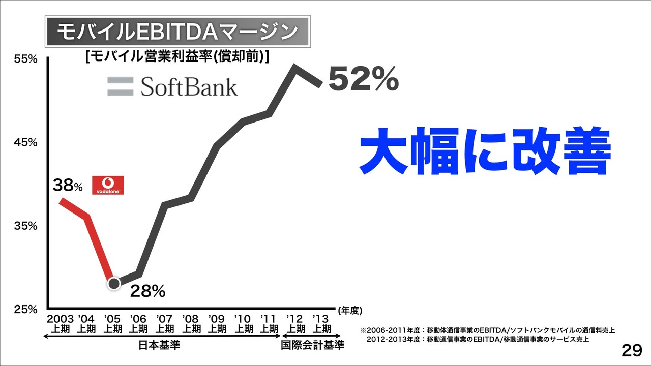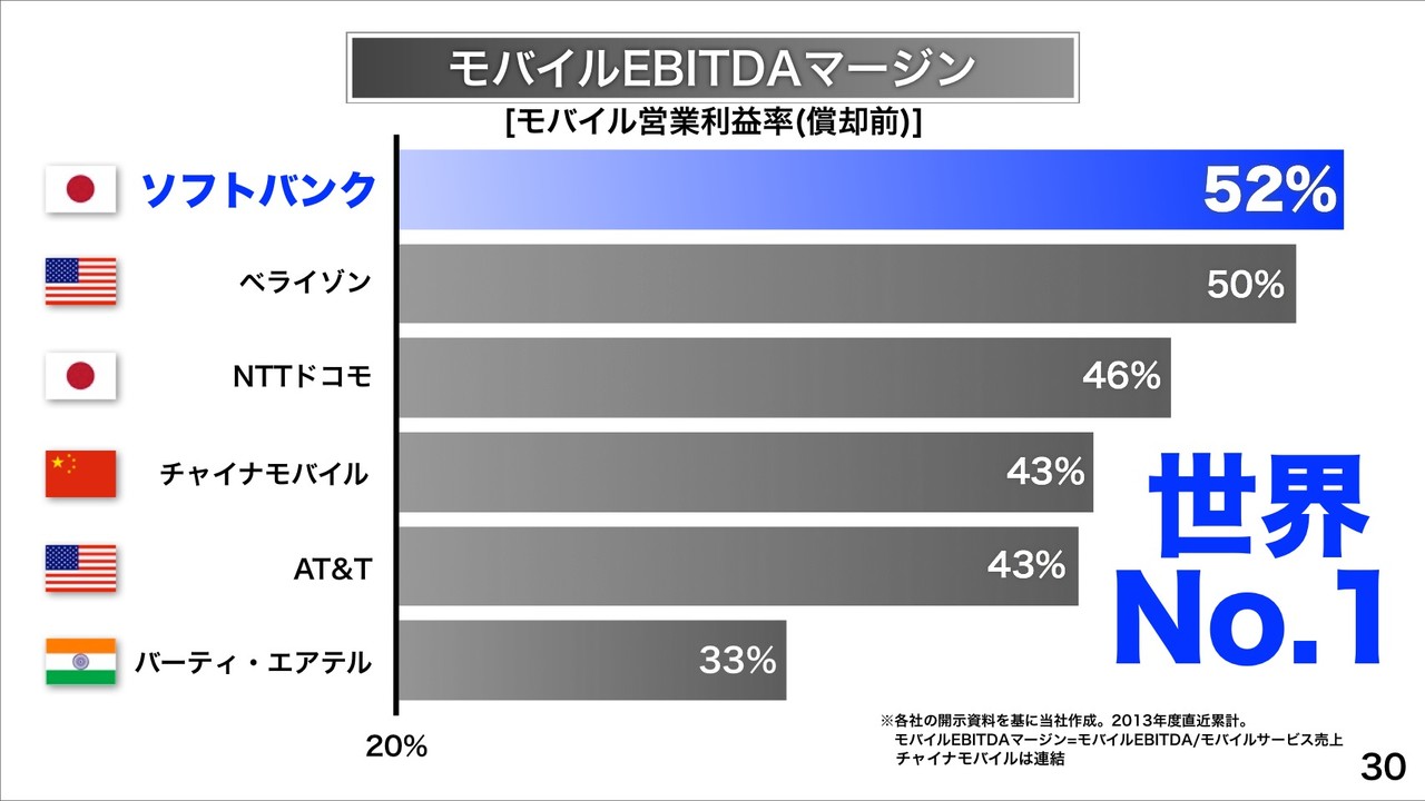 モバイルEBITDAマージン(償却前モバイル営業利益率)が52%で。ボーダフォン・ジャパン買収時の28%から大幅に改善し、世界の主要通信会社と比較してもNo.1の収益性と説明。