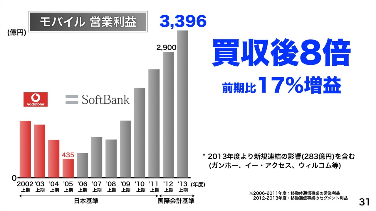 モバイル営業利益が3,396億円で、前年同期比17%増益と、2006年のボーダフォン・ジャパン買収時と比較して8倍規模になったとのこと。なお、2013年度からガンホーやイー・アクセス、ウィルコムなど新規連結の影響(283億円)を含むとしています。