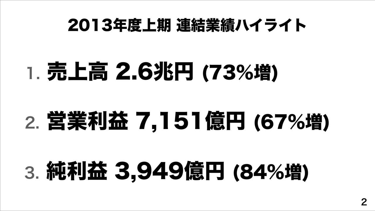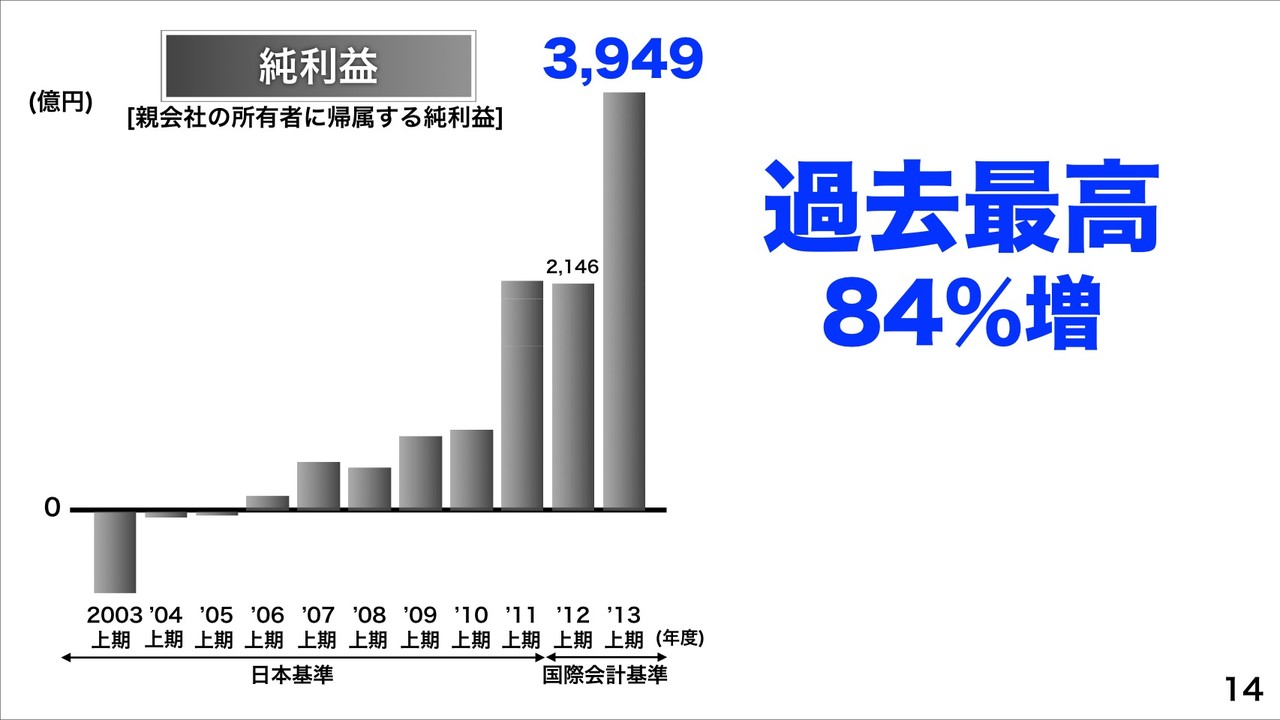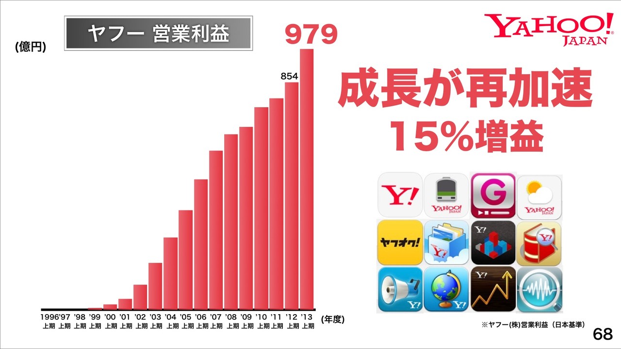 例えば、「イーコマース世界No.1へ」向けて、ヤフージャパンでは、営業利益が2013年度上期で979億円。成長が再加速しており、15%増益。