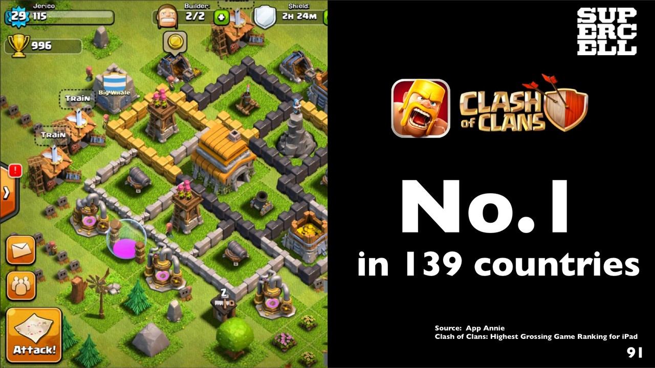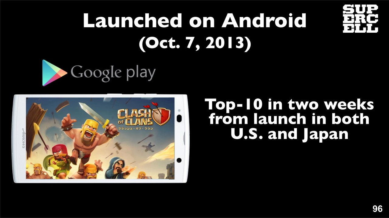 SuperCellは、App Store売上世界ランキング(ゲーム別)で同社が提供する「Clash of Clans」は139カ国でNo.1になっており、新しい「Hay Day」も102カ国でNo.1になっているとのこと。