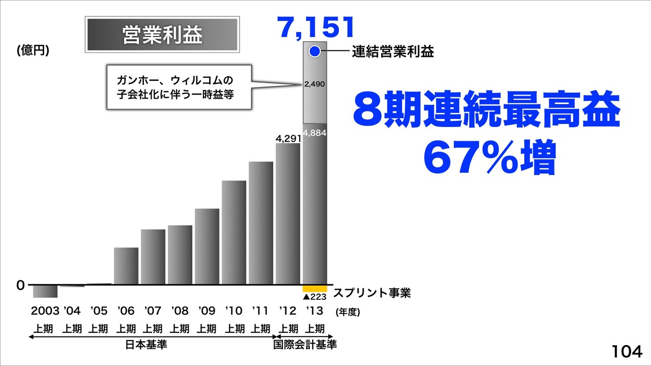 連結営業利益7,151億円で前年同期比67%増。これは、ガンホーやウィルコムなどの子会社化に伴う一時益などの2,490億円を含み、Sprint事業営業損失223億円を相殺し、8期連続最高益。