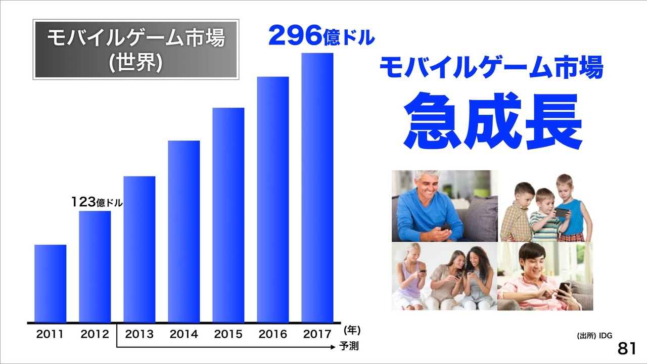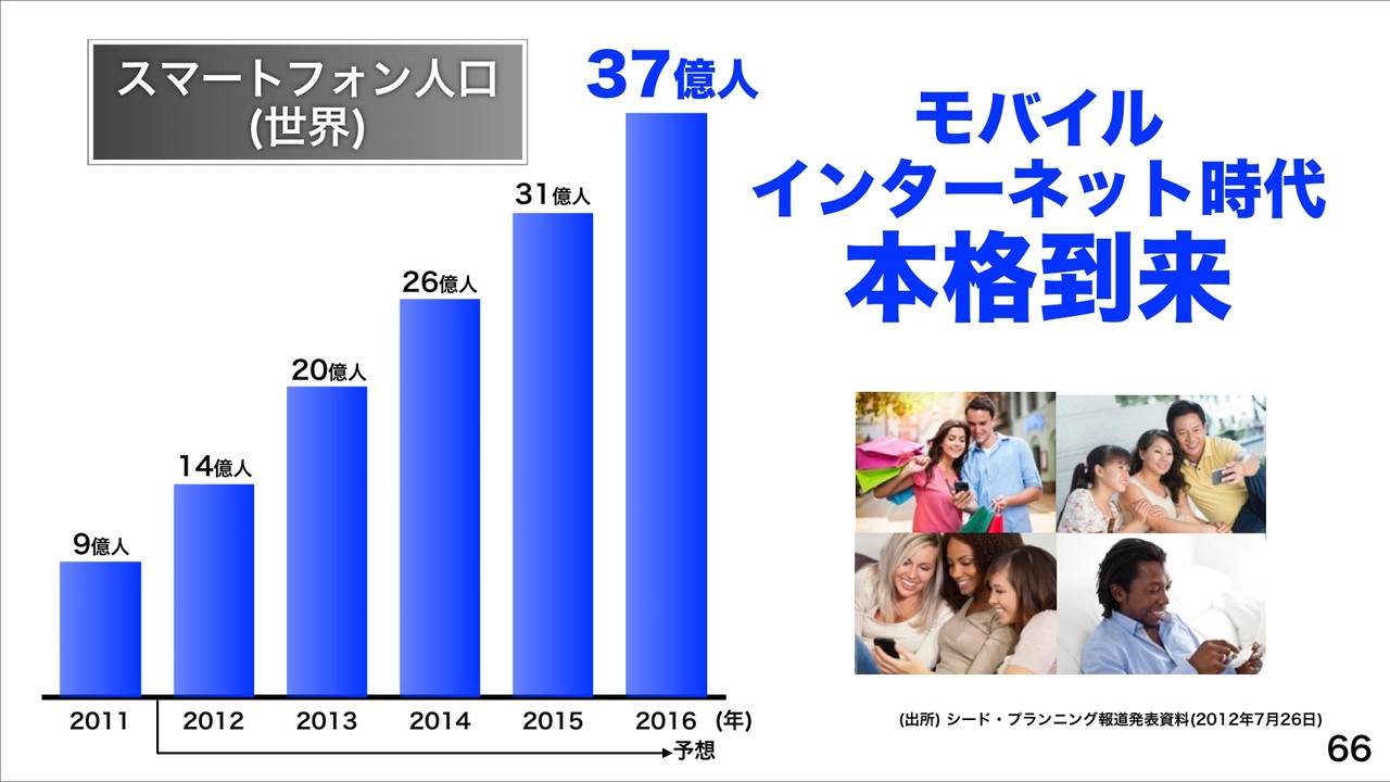 さらに、「スマホ時代のコンテンツNo.1へ」ということで、世界のスマートフォン人口が2016年に37億人と予想するシード・プランニングの調査からモバイルインターネット時代本格到来だとし、さまざまなコンテンツでNo.1をめざすことを紹介。