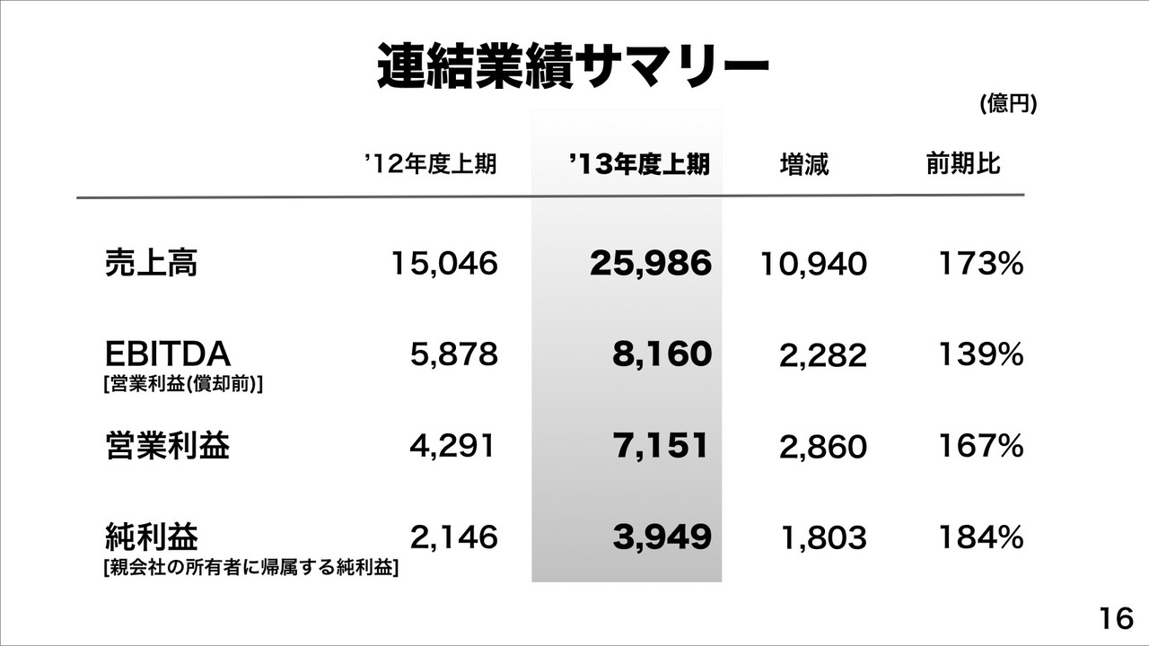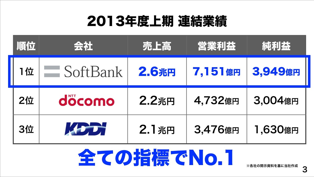 また、連結純利益3,949億円で前年同期比84%増も過去最高。これについても、NTTドコモを逆転。2013年度上期における連結業績サマリーとしては、売上高が2兆5,986億円、EBITDAが8,160億円、営業利益が7,151億円、純利益が3,949億円となっています。