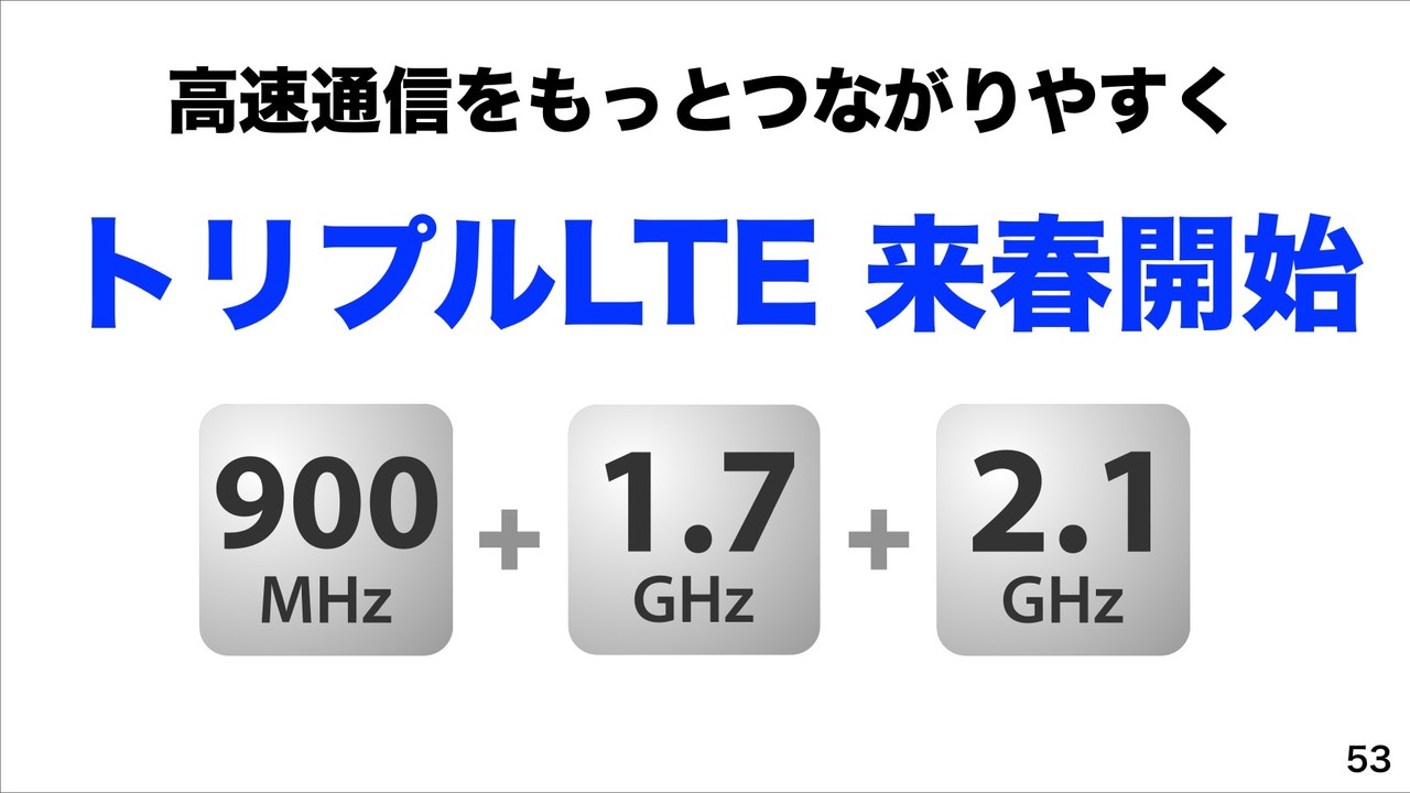 さらに、高速通信をもっとつながりやすくということで、来春にもプラチナバンドの900MHzでのLTEを開始し、1.7GHzおよび2.1GHzと合わせて「トリプルLTE」になることを紹介し、設備投資を前倒しにしていることを紹介していました。