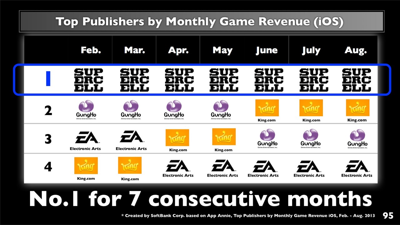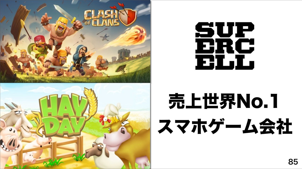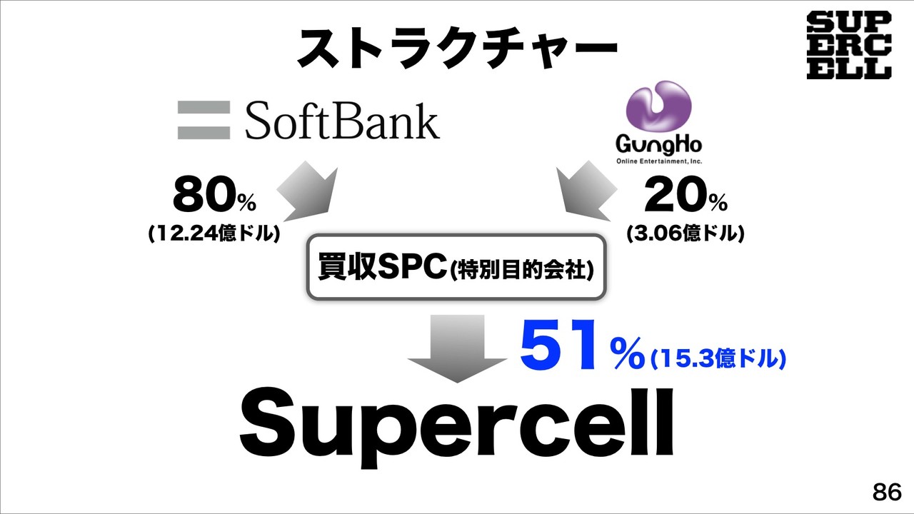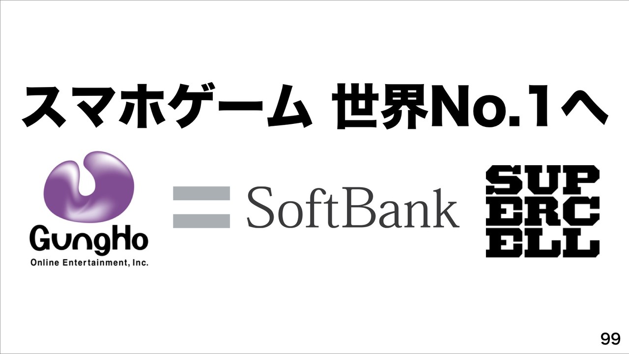 さらに、2013年10月にソフトバンクが80%、ガンホーが20%の特別目的会社を通して、売上世界No.1スマホゲーム会社「SuperCell」の株式51%取得に合意したことを発表したことも紹介。