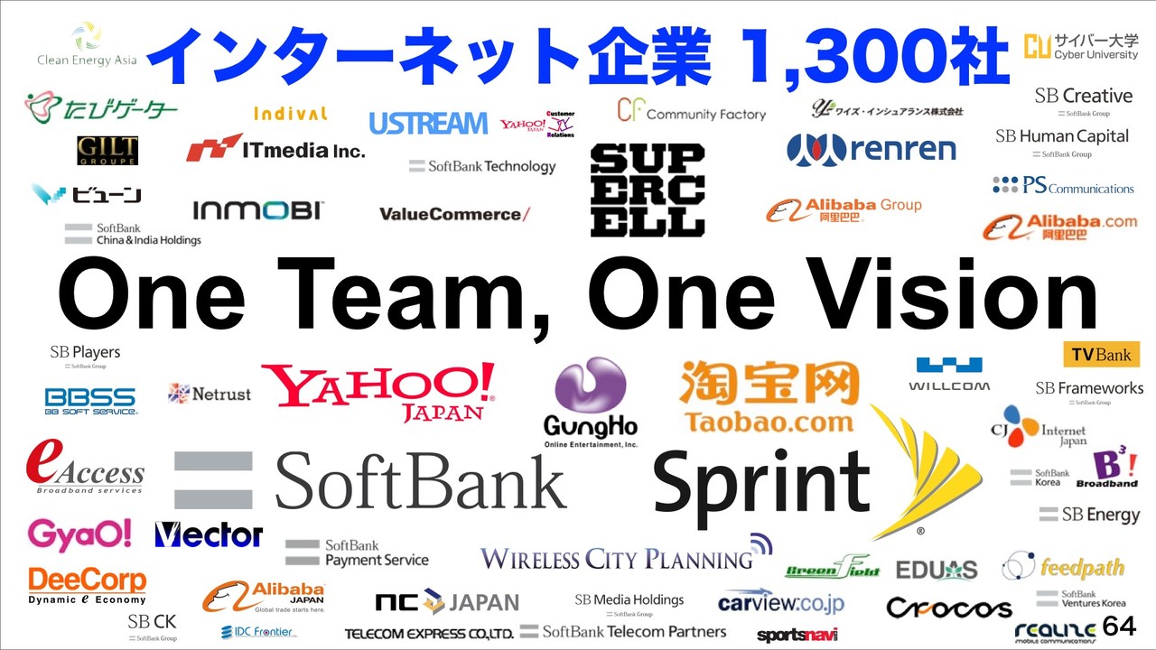 ソフトバンクやSprintを筆頭にソフトバンクグループインターネット企業1300社で「One Team, One Vision」と、同じ夢に向かって一丸となってNo.1をめざすとしています。