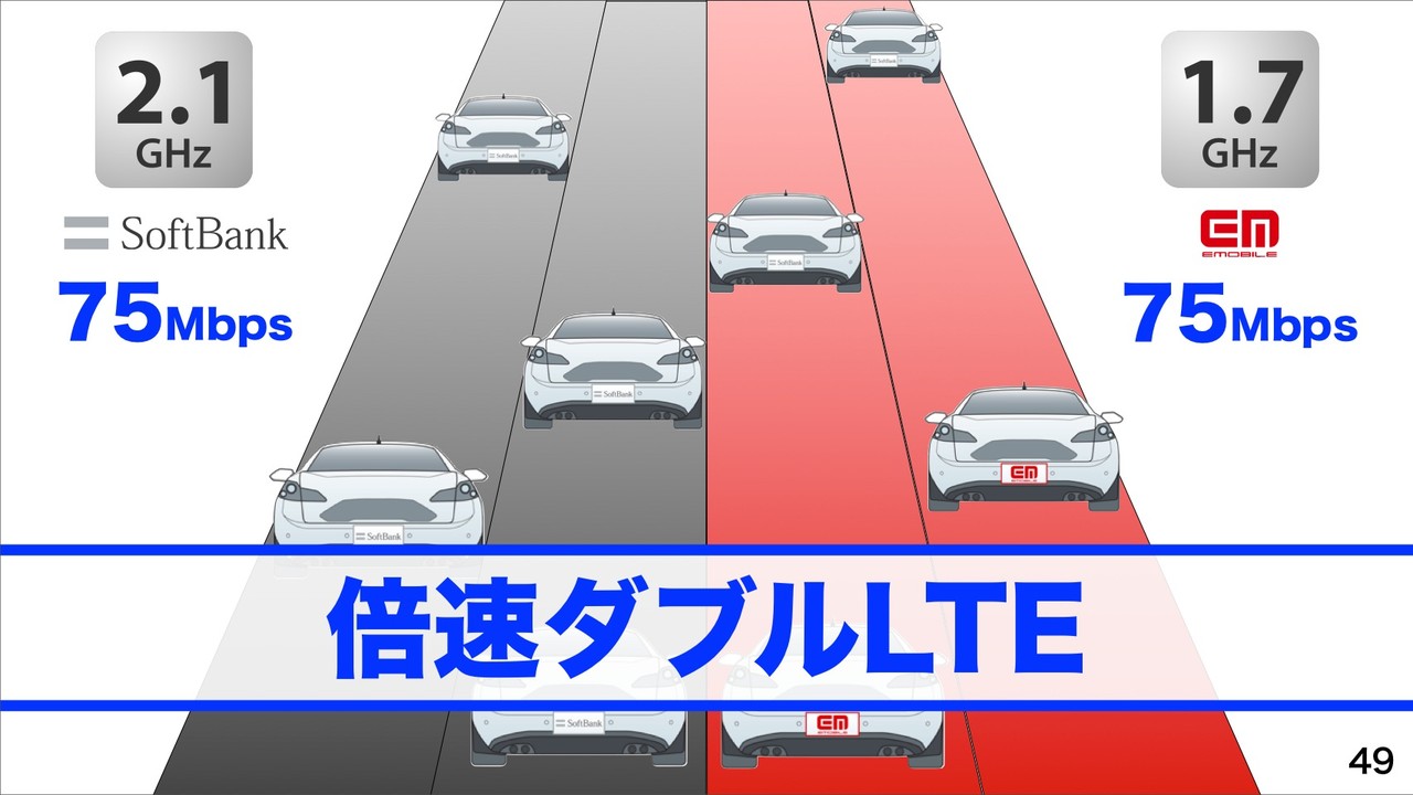 ソフトバンクモバイルの2.1GHzとイー・モバイル1.7GHzでそれぞれ10MHz幅×2による75Mbpsを導入した「倍速ダブルLTE」になっていることで、ダウンロード速度は全国で大幅に改善したことを紹介。