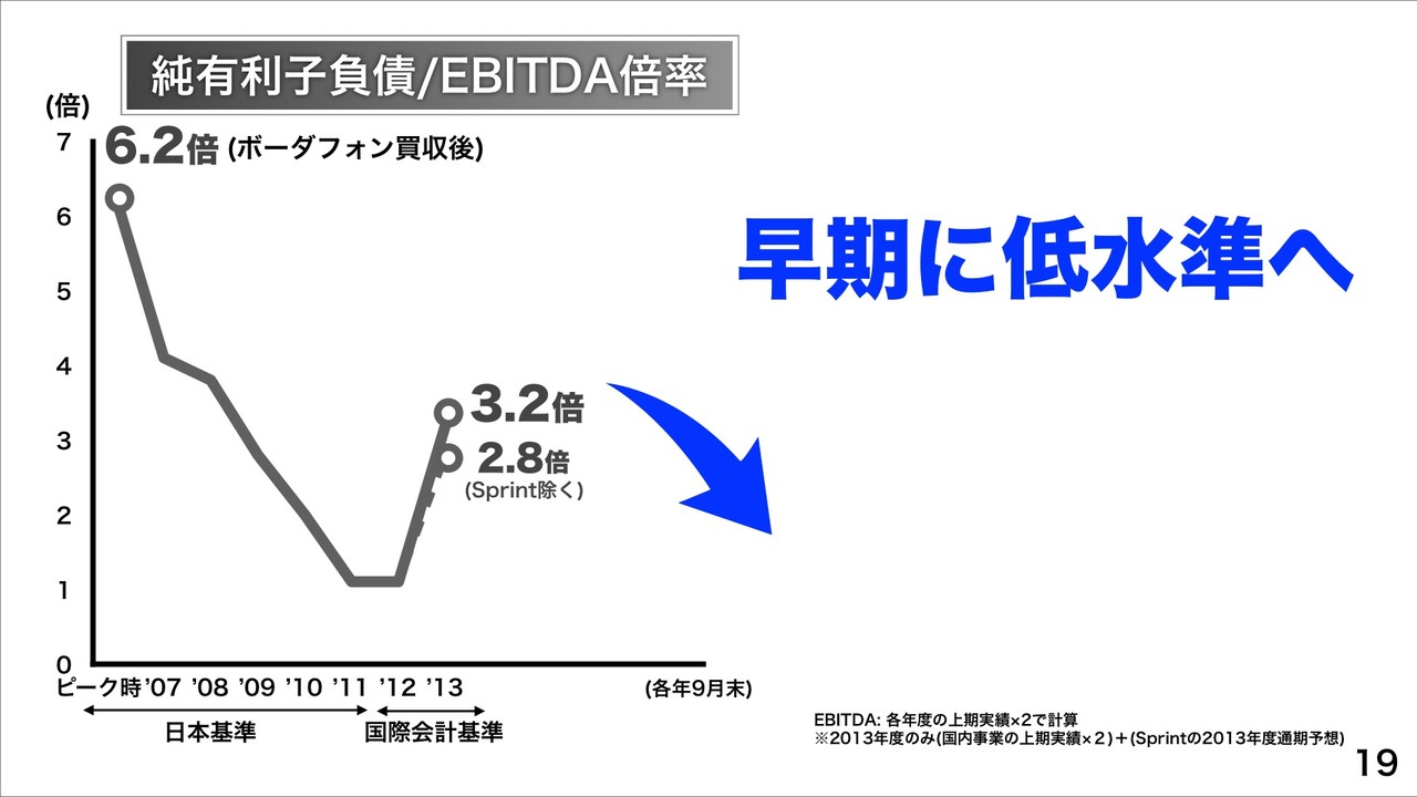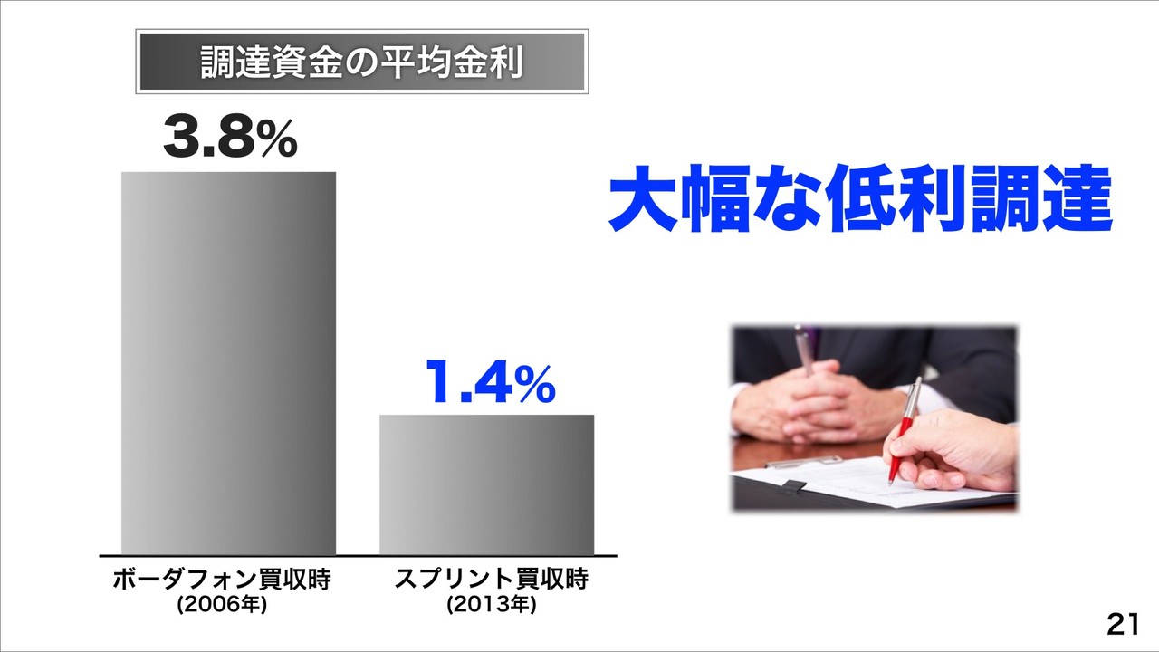純有利子負債およびEBITDA倍率は、Sprint買収完了時に3.2倍に達したとのことですが、早期に低水準をめざすという以前からの言葉通りで、Sprint買収資金などのリファイナンスの金利が1.4%で、2006年のボーダフォン・ジャパン買収時と比較しても大幅な低利調達したことを改めて説明。