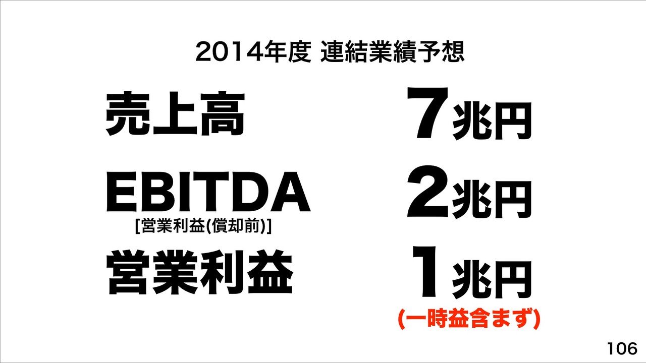 最後に2014年度(2015年3月期)の連結業績予想では、売上高が7兆円、EBITDAが2兆円、営業利益が1兆円をめざし、「あらゆる面で世界No.1へ。」の夢に向けて邁進していくということです。