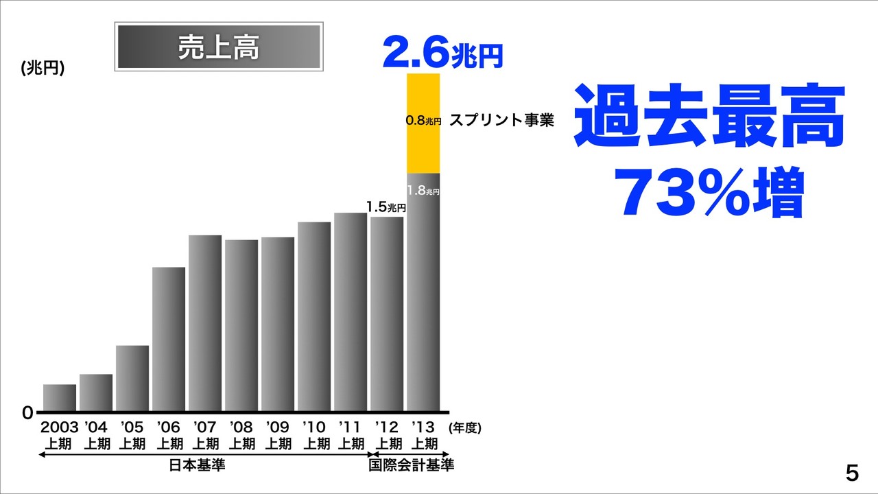 プレゼンテーションでは、その後、連結業績ハイライトから紹介。売上高が2.6兆円(前年同期比73%増)、営業利益7,151億円(同67%増)、純利益3,949億円(同84%増)、すべての指標で国内携帯電話会社3キャリアの中でNo.1になったと説明。なお、連結業績は国際会計基準を適用。