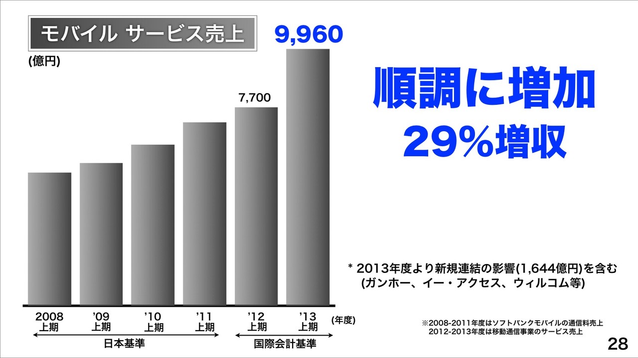 モバイルサービスの売上が9,960億円で前年同期比29%増収。これは、ガンホーやイー・アクセス、ウィルコムなどの新規連結の影響(1,644億円)も含み、順調に増加しているそうです。