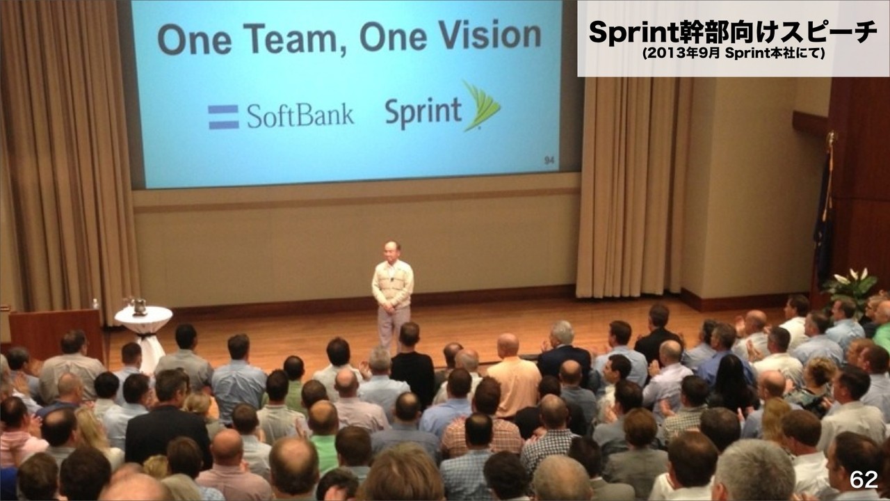 ここで、AppleがiPhoneを発売する前に当時のCEOであったスティーブ・ジョブス氏に会い、日本国内でのiPhoneの独占販売を口約束したことを紹介し、「ボーダフォン・ジャパン買収はこの口約束があったから実行した。」とし、「同じようにSprint買収にはClearwireの大幅に保有する2.5GHz帯があったから実行した。」と説明。この周波数帯があれば、数Gbpsという通信速度も夢ではなく、米国市場でNo.1になれると説明していました。