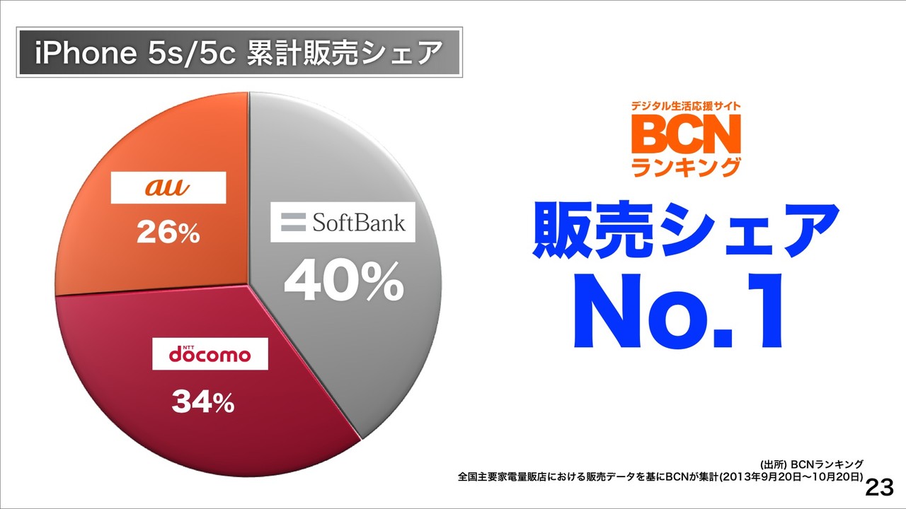 次に、9月20日に販売が開始された新しいiPhoneについても、NTTドコモが国内では新たにiPhone販売を開始しましたが、その後もソフトバンクモバイルがiPhone 5sおよびiPhone 5cの累計販売シェアNo.1になっているほか、純増No.1キャリアの地位も堅持していると説明。