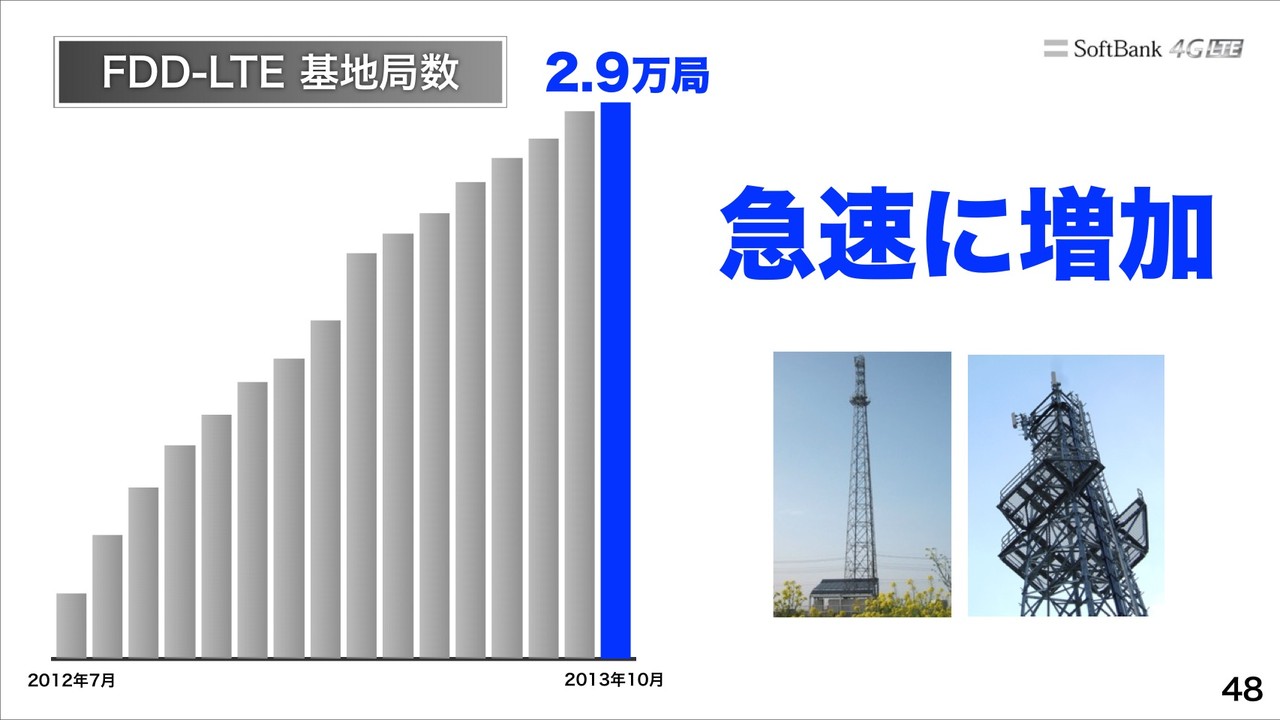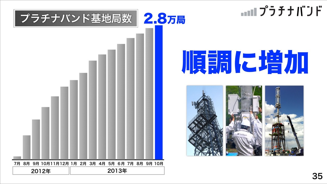 事業内容の説明に移り、まず、「スマホ時代のネットワークNo.1へ」と直近で説明している内容を繰り返し紹介。スマホのつながりやすさNo.1では、プラチナバンド基地局数が2013年10月時点で2.8万局と順調に増加しているということです。