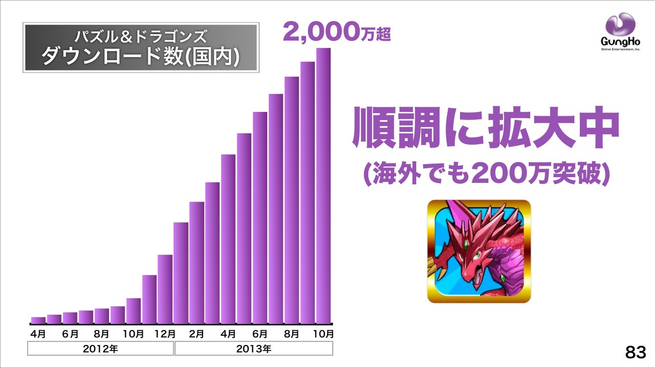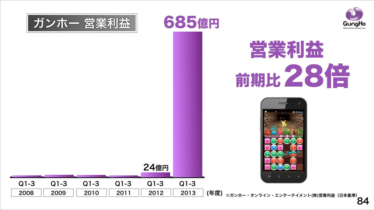 ソフトバンクグループでは「スマホゲーム世界No.1へ」向けて、ガンホーの「パズル&ドラゴンズ」ダウンロード数が2013年10月時点で国内2000万超、海外でも200万突破と順調に拡大中であり、ガンホーの営業利益が2013年度Q1~3で685億円、前期比28倍となっていると説明。