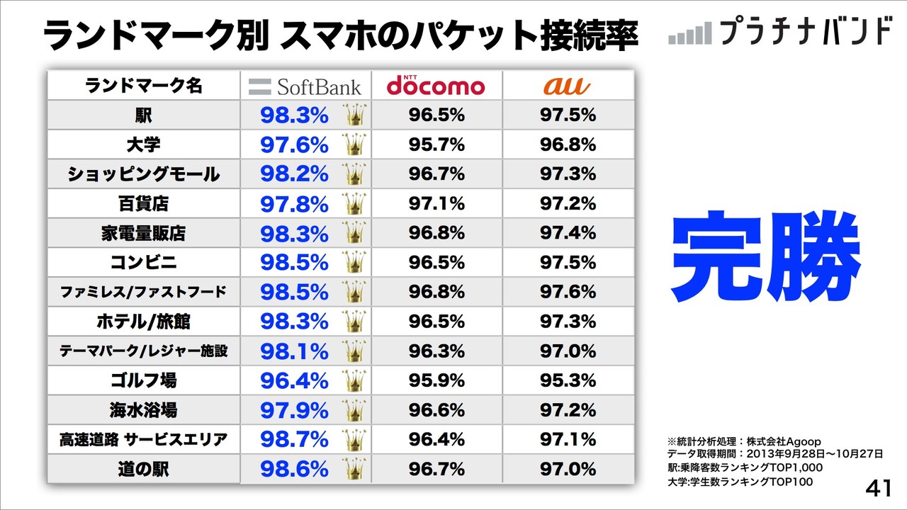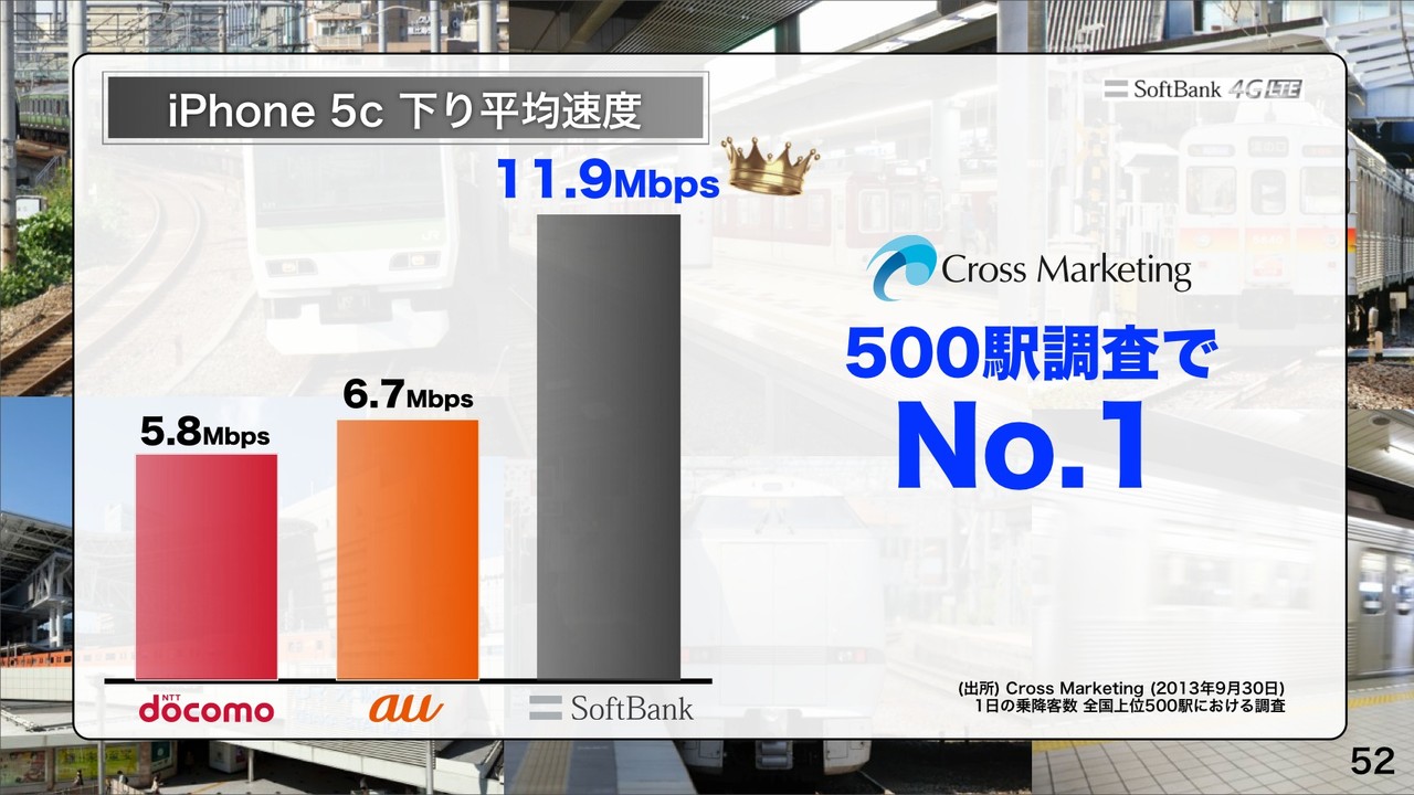 Cross Marketingによる2013年9月30日に公開された「日本全国乗降客数上位500駅調査」でもiPhone 5cで下り平均速度の駅数No.1、下り平均速度No.1。外部調査でも圧倒的な結果になったとしていました。