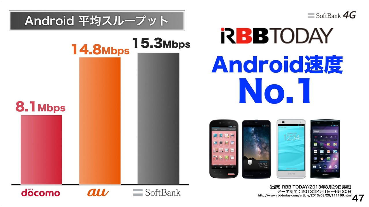 2013年度上期(2013年4~9月)の純増数が191万件(ソフトバンクモバイル、ウィルコム、イー・モバイル計)に達し、au by KDDIやNTTドコモとの3社比較でも圧倒的No.1であるとしました。2013年度上期のMNP転出入28万件で前期比倍増、ARPUも4,520円と、NTTドコモやau by KDDIとの3社比較でも他社が減速する中で順調に推移しているということです。