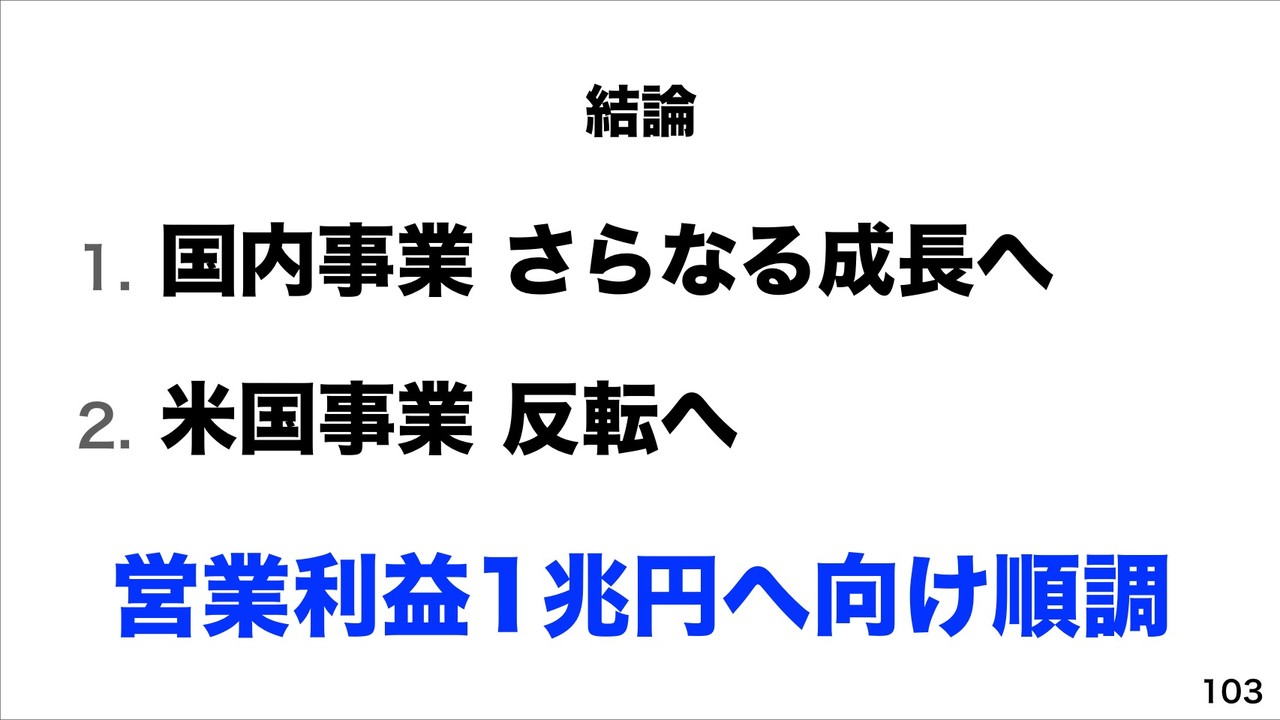 まとめに移り、国内事業では「さらなる成長へ。」向けて、米国事業では「反転へ。」とそれぞれ業績を伸ばすことで、営業利益1兆円へ向け順調に推移していると説明していました。