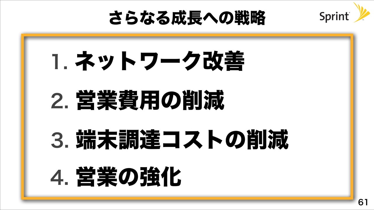 Sprintさらなる成長への戦略としては、ネットワーク改善および営業費用の削除、端末調達コストの削減、営業の強化の4本柱で行うということです。
