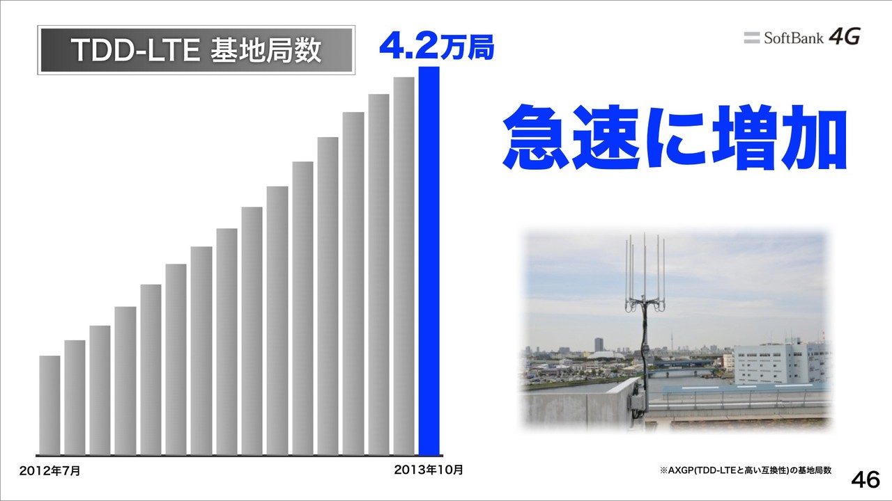 さらに、高速通信の速度No.1として、TDD-LTE互換AXGP基地局数は、2013年10月に4.2万局と急速に増加。Androidの平均スループットもRBB TODAYの調査で15.3Mbpsと速度No.1。(2013年8月29日時点、データ期間:2013年4月1日~6月30日)。FDD-LTE基地局数も2013年10月に2.9万局と急速に増加。