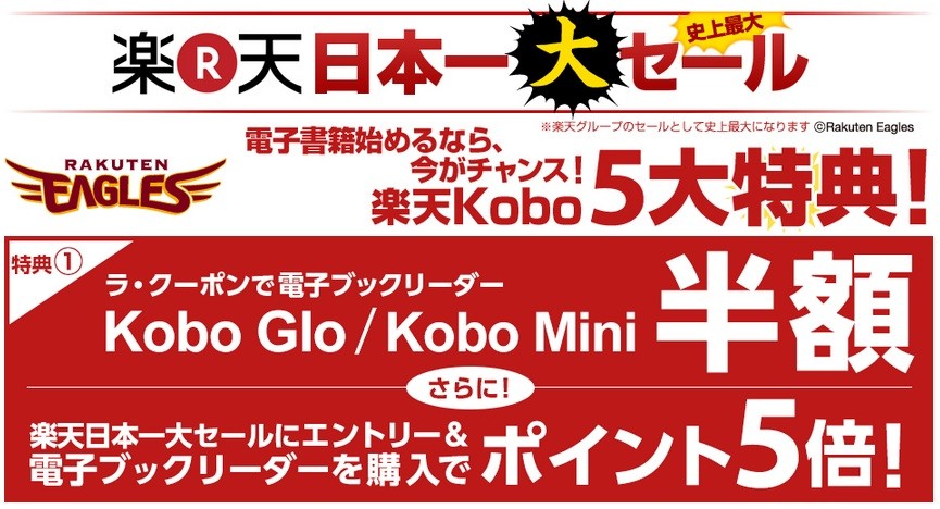 特典1:ラ・クーポンで電子ブックリーダー「Kobo Glo」および「Kobo Mini」が半額、楽天日本一セールにエントリー&電子ブックリーダー購入でポイント5倍