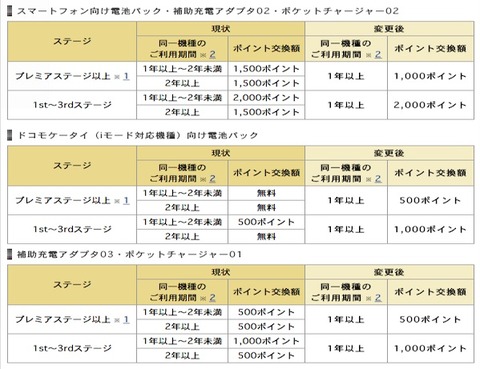 これまで、iモードケータイ(フィーチャーフォン)では利用期間によって電池パックを無償でもらえていたものが廃止され、ドコモポイントとの交換という実質値上げされたのに対し、スマートフォン向け電池パックや補助充電アダプタ02、ポケットチャージャー02についてはプレミアステージ以上であればドコモポイントの値下げが行われています。