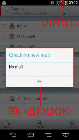 対応アプリで一番分かりやすい変更点は、ドコモUIMカードがない状態でもサービスを使えるようになっている点です。Wi-Fiでインターネットにつながっていれば、ドコモUIMカードを抜いてある状態でもそのままサービスが使えます。上の画像は、アップデート後のドコモメールとiコンシェルを、docomo IDを保存してドコモUIMカードを抜いたF-01Fで使った様子をキャプチャーしたものです。