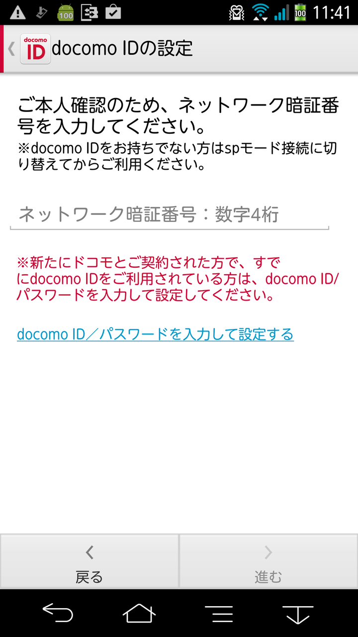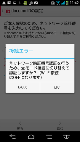 docomo ID認証のセットアップは、標準では携帯電話番号(回線)に設定した4ケタのネットワーク暗証番号で行います。docomo IDとパスワードの組み合わせでセットアップすることもできます。筆者はセットアップ当時、この回線のdocomo IDを完全に失念していたため、ネットワーク暗証番号認証をすることにしました。ネットワーク暗証番号での認証は、spモード経由で行うため、Wi-Fi接続中だと切断するように求められます。当然、素直に従います。