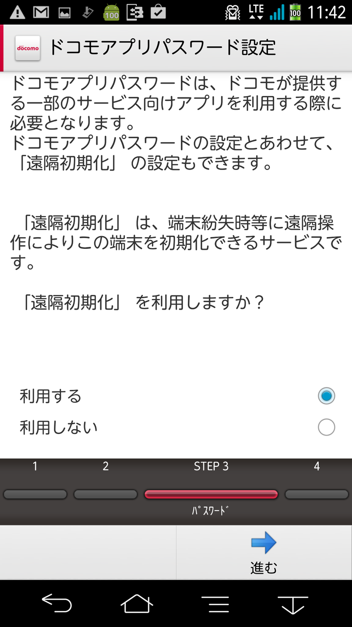 docomo IDの設定が終わると、ドコモアプリのパスワード設定です。筆者の場合、既に設定してあったせいか、My docomoから端末をリモート初期化できる「遠隔初期化」を有効にするか否かの問い合わせのみとなりました。