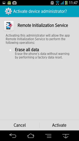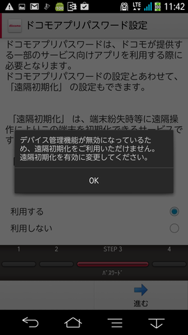 この画面で遠隔初期化を有効にすると、「デバイス管理機能が無効になっている」という旨が表示される場合があります。その場合は、セットアップ完了後、本体設定の「セキュリティ」内にある「デバイス管理機能の選択」から「遠隔初期化」を有効にしましょう。