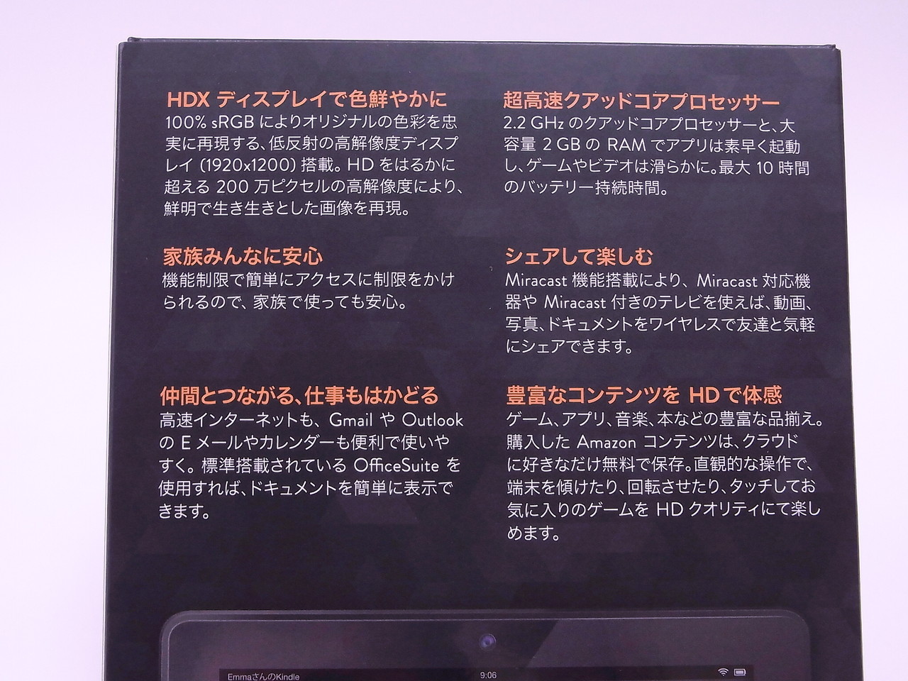 上部には「Kindle Fire HDX」の特徴が記載されています。