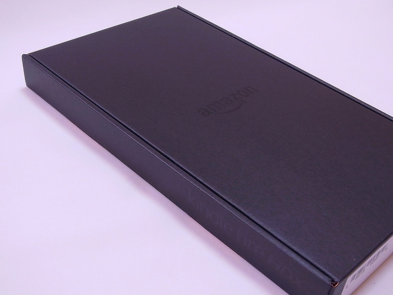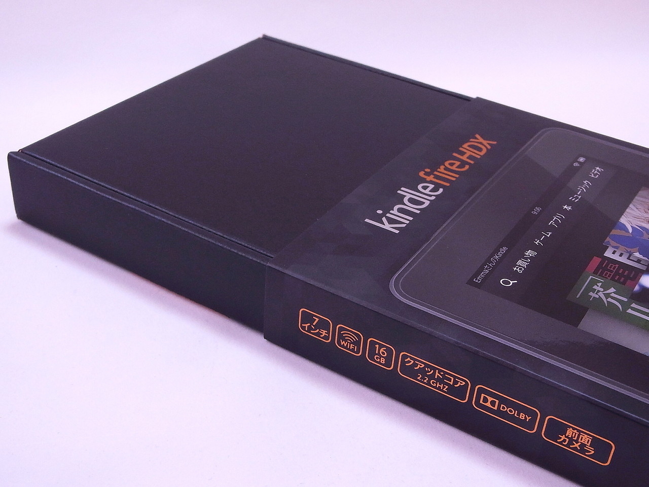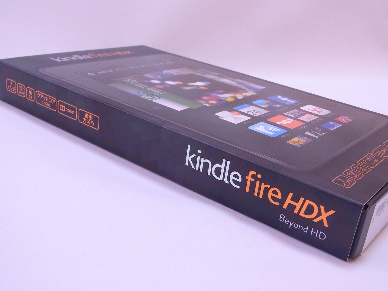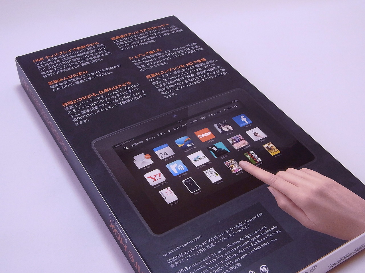 黒をベースにアプリアイコンの写真がプリントされた「Kindle Fire HDX」の文字が輝くパッケージになっています。