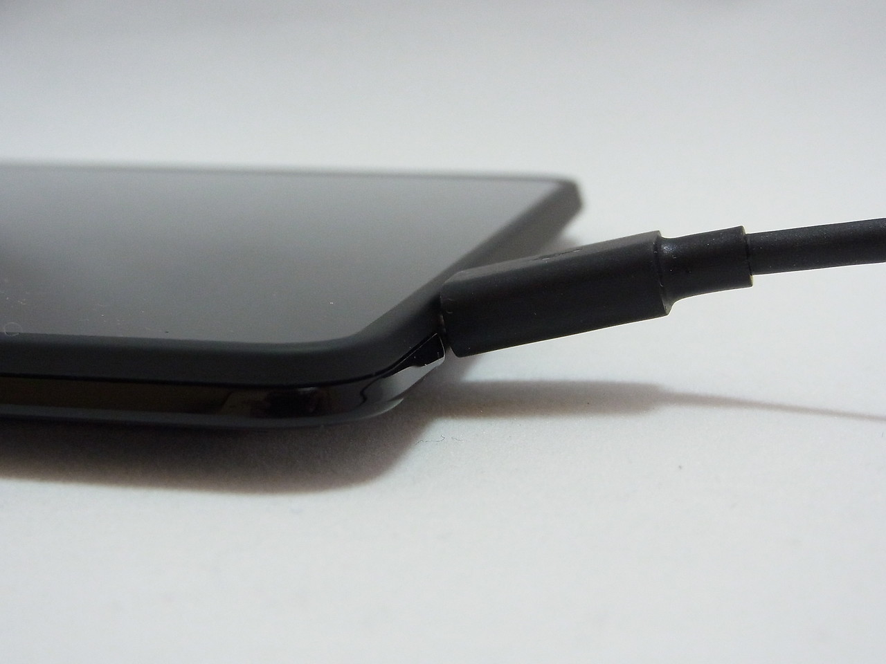 背面が斜めにカットされているため、microUSBケーブルを挿すと写真のような傾斜角度となります。「おやっ?」と思って無理に真っ直ぐにしないようにお気をつけください。