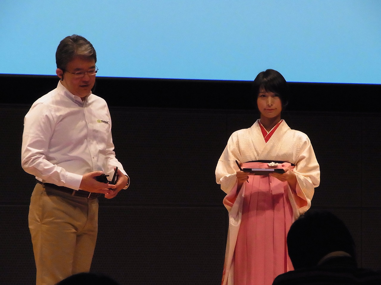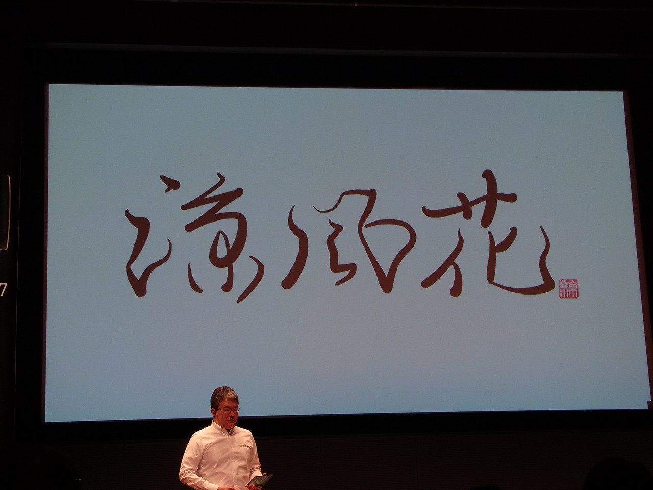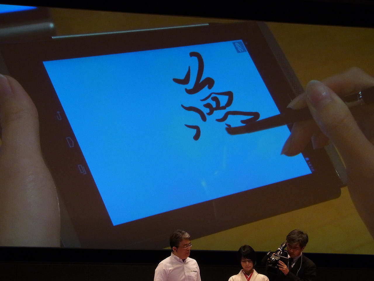 また、美人すぎる書道家としても有名な「涼風花」さんも壇上に上がり、Tegra Note 7のスタイラスを体験していました。スタイラスペンなのですが、筆のような感覚で利用できる点や、他社のタブレットでは書いている最中に筆跡が途切れてしまうような微妙な力加減も、見事に再現してくれるので非常に書きやすいとのことでした。