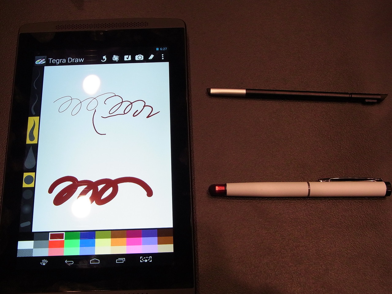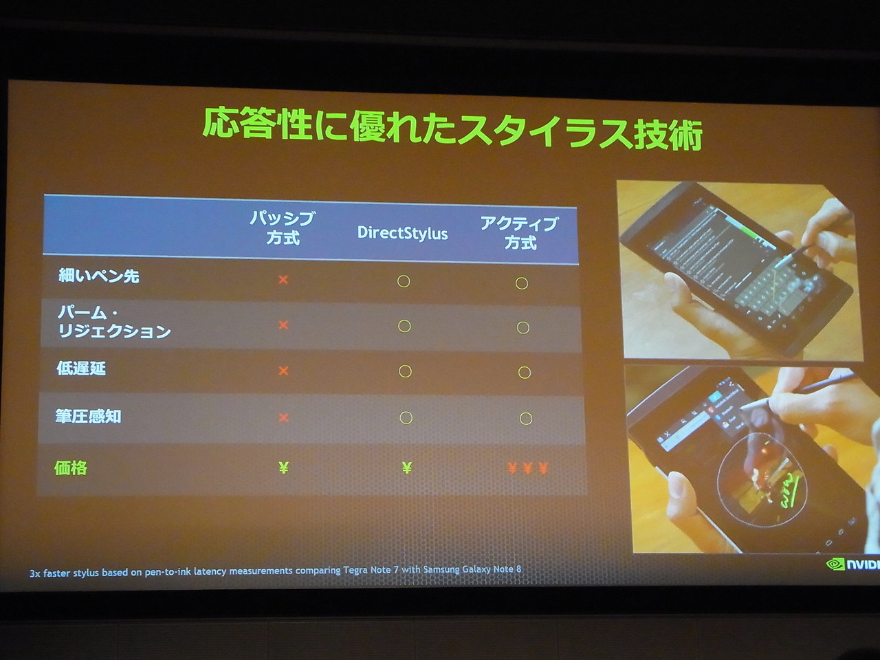 7インチタブレットとしては珍しくスタイラスペンを備えたTegra Note 7は、他のスマートフォンやタブレットに搭載されている静電容量式のディスプレイを改良し、ワコム式とも呼ばれる電磁誘導式スタイラスと同等の操作性を低価格で搭載することに成功したそうです。